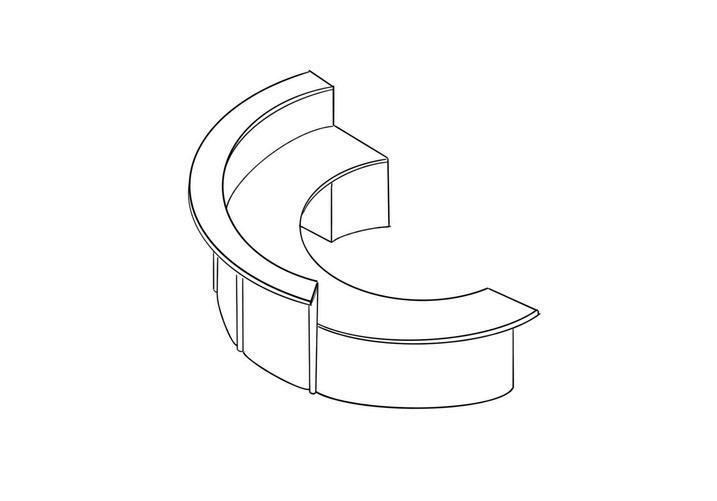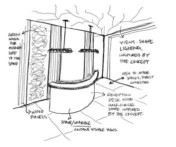 The reception desk design features a half-circular form, symbolizing the heart and mind as integral halves of human balance, inspired by the conceptual thinking and diagrams showed earlier