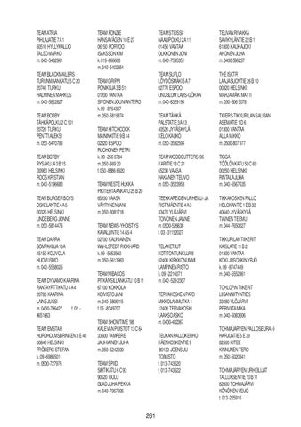 TEAM ATRIA PIHLAJATIE 7 A 1 60510 HYLLYKALLIO TALSO MARKO m. 040 -5462961 TEAM BLACKMAILERS TURUNMAANKATU 5 C 20 20740 TURKU HALMINEN MARKUS m. 040 -5822827 TEAM BOBBY TÄHKÄPOLKU 2 C 101 20720 TURKU PENTTI ALEKSI m. 050 -5470786 TEAM BOTBY RYSÄKUJA 3 B 15 00980 HELSINKI ROOS KRISTIAN m. 040 -5196683 TEAM BURGER BOYS OSKELANTIE 4 A 6 00320 HELSINKI LINDEBERG JONNE m. 050 -5814476 TEAM DARRA SOMPAKUJA 10 A 45150 KOUVOLA HUOVI ISMO m. 040 -5568026 TEAM DYNAMO KAARINA RANTAYRTTIKATU 4 A 4 20780 KAARINA LAINE JUSSI m. 0400-786427 f. 02 4651663 TEAM EMSTAR HURDHOLMSBRINKEN 3 E 40 00840 HELSINKI FRÖBERG STEFAN k. 09 -6986501 m. 0500-727976