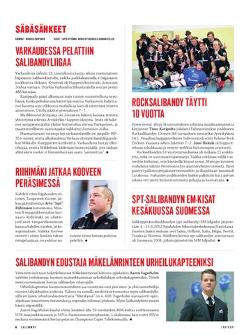 ROCkSALIBANDY TÄYTTI 10 VUOTTA Power metal -yhtye Stratovariuksen solistina maailmanmainetta korjannut Timo Kotipelto johdatti Tulivuorirockin joukkueen Rocksalibandyn 10:nnen SM-turnauksen mestariksi Jyväskylässä 14.1. Finaalissa lappajärveläinen Tulivuorirock voitti Volume Rock Cocksin Vaasasta selvin lukemin 7 – 2. Jussi Hakala oli loppuottelussa tehokkaana ja venytti verkkoa hattutempun arvoisesti. Rocksalibandyn 10-vuotisturnauksessa oli mukana 15 joukkuetta, mikä on uusi osanottajaennätys. Vaikka otteluissa välillä tunteetkin kiehuivat, niin käytävillä kitarat soivat. Myös perinteinen viuhahdus nähtiin Provinssirockin alastonryhmän toimesta. Päivä päättyi palkintojenjakoseremonioihin ja iltajuhlaan tanssisali Lutakossa. Parhaiden joukkueiden lisäksi palkittiin liuta päivän aikana eri tavoin kunnostautuneita pelaajia ja kannattajia.
