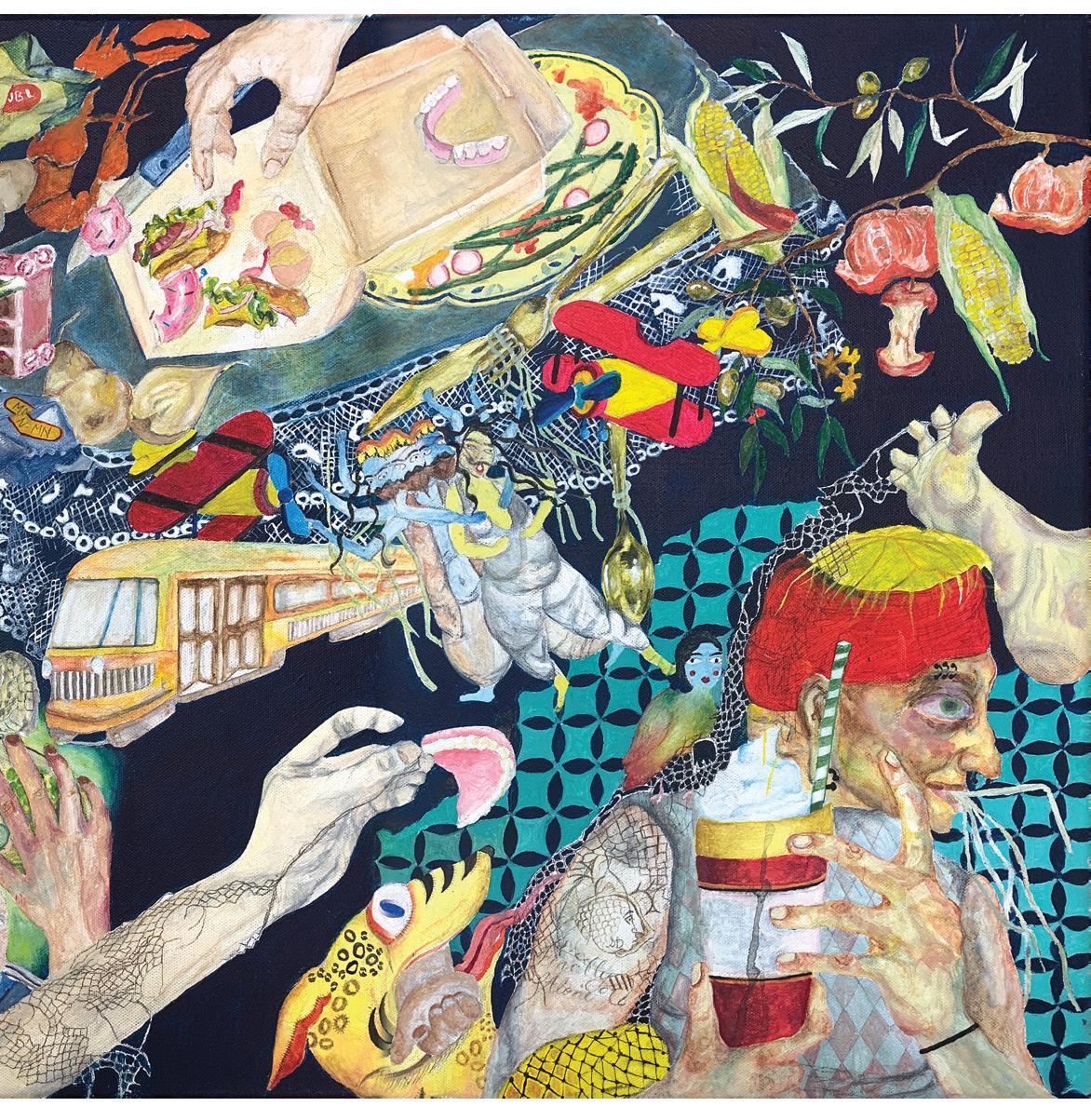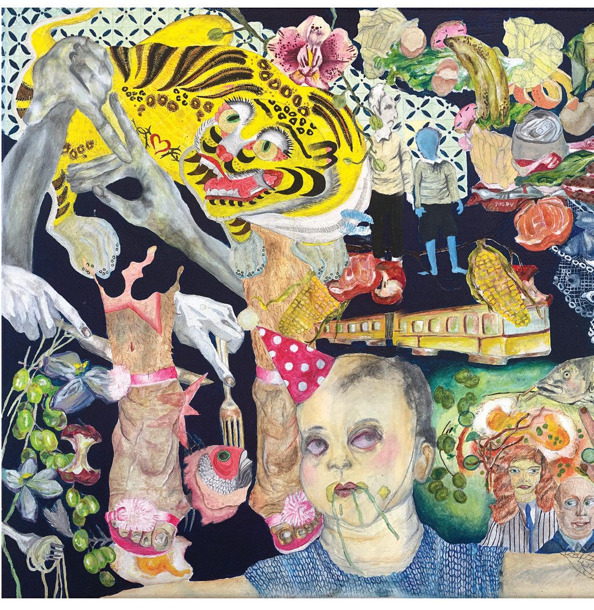 My name is Sanjukta Dey, and this work is a loose mosaic of my past year. I painted while eating, talking, laughing, and sobbing during beautiful moments shared with my friends and family. I moved between distraction and focus, without any vision. I wanted to play with space, colour, and texture, but above all, I wanted to play. This is the second part of a series, returning to a piece I made earlier in life.