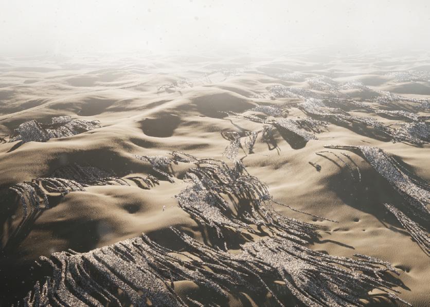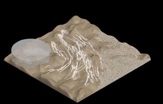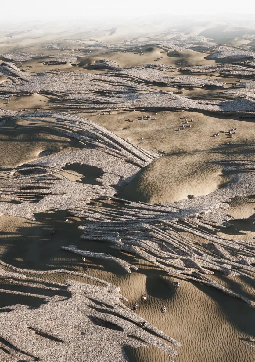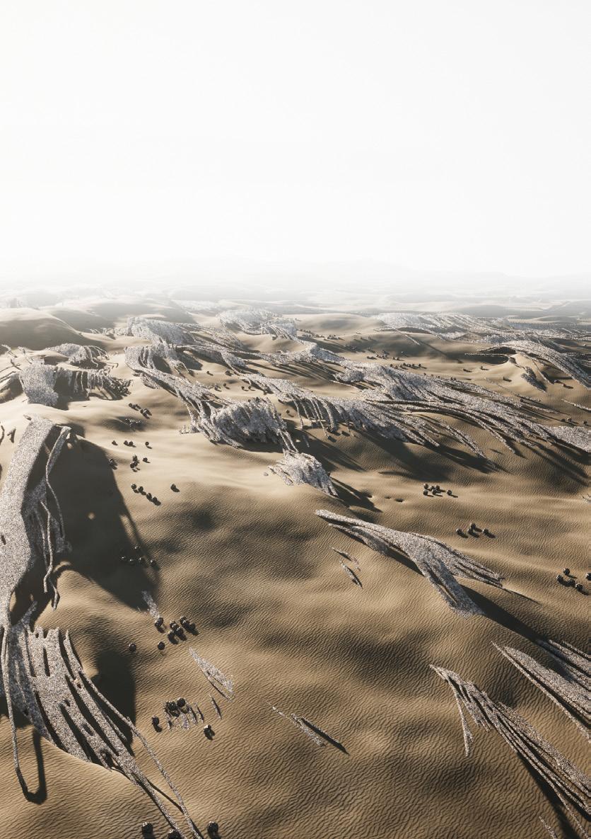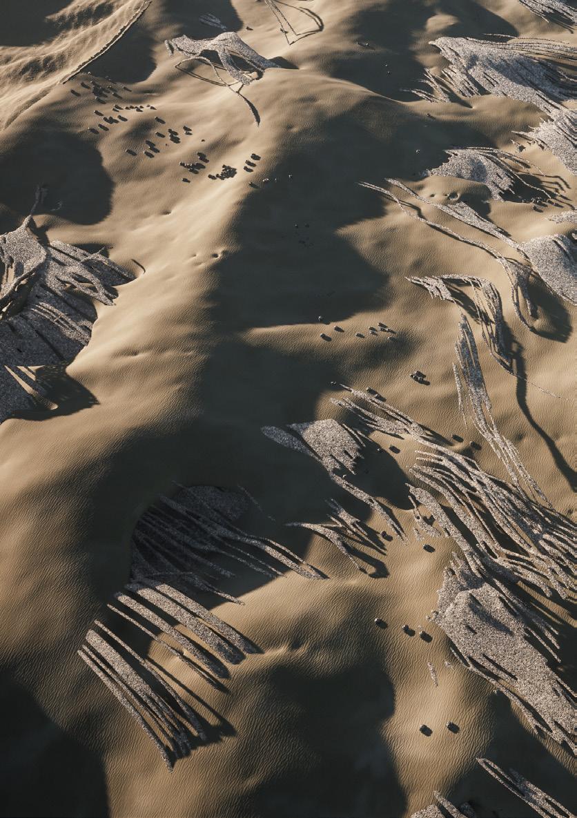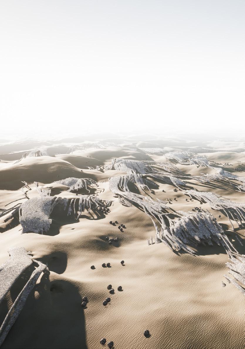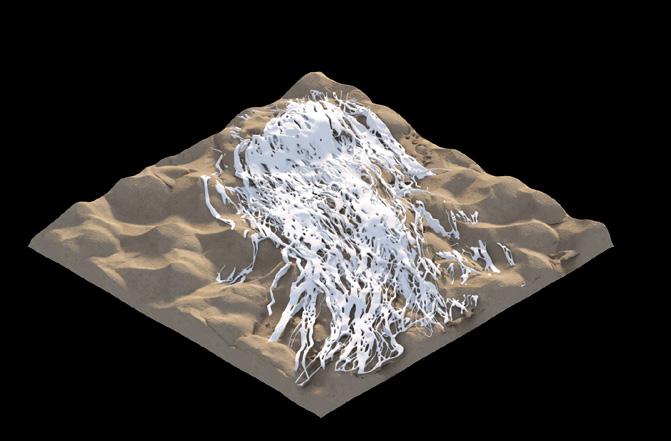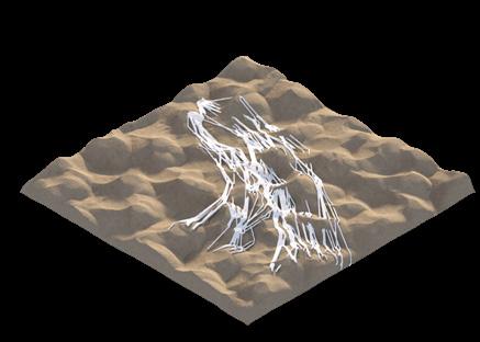 The agents are programmed to be autonomous in the decision making of on-site fabrication, the trajectory of movement, and collaborative production. The network of movement is logistically simulated according to the local data and satellite imagine. This network is constantly changing with the movement of dunes and alterations to the landscape, creating a one-to-one dialogue between agents and the dynamic landscape.