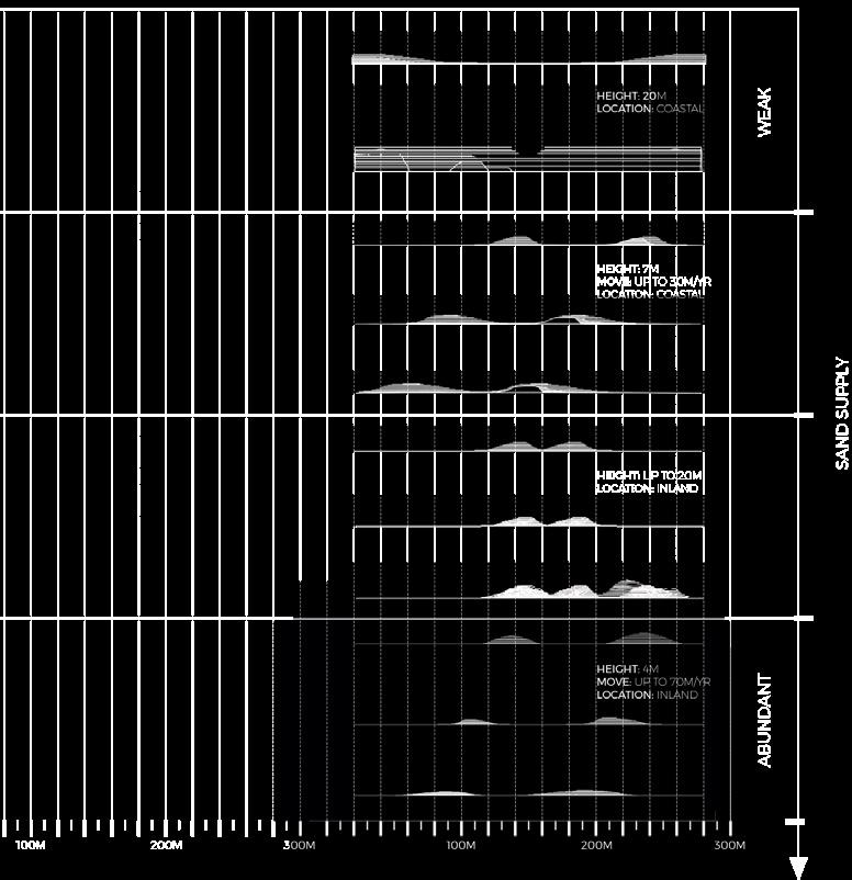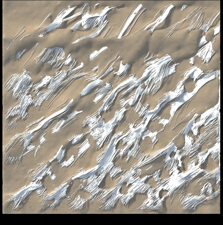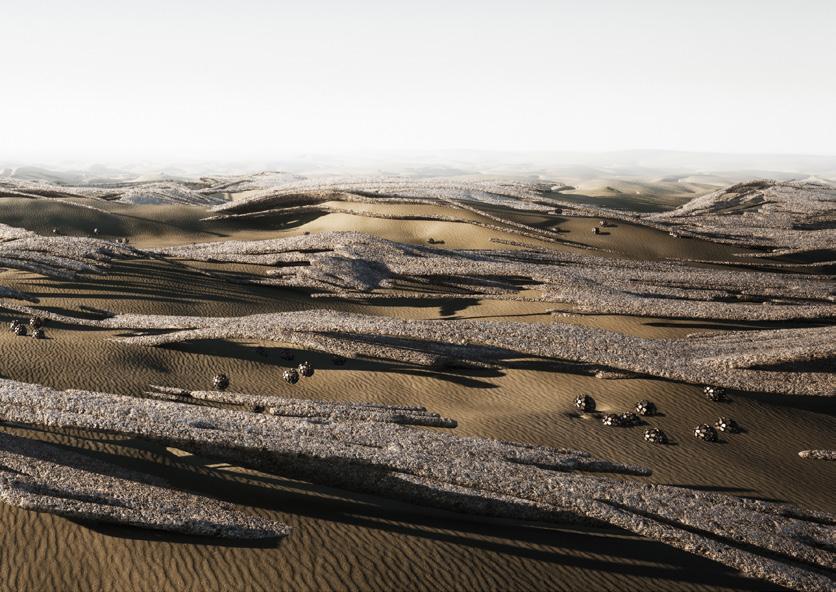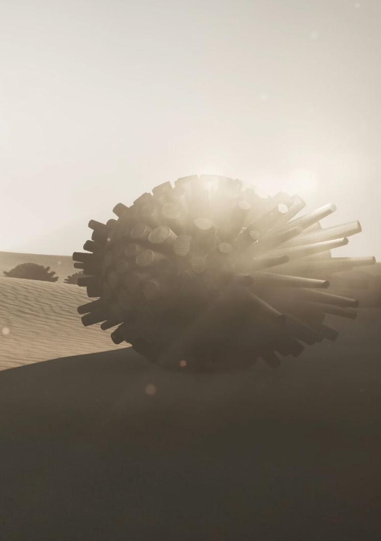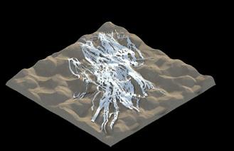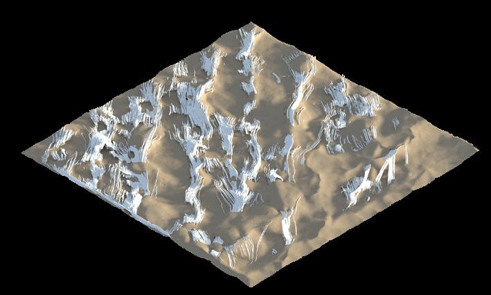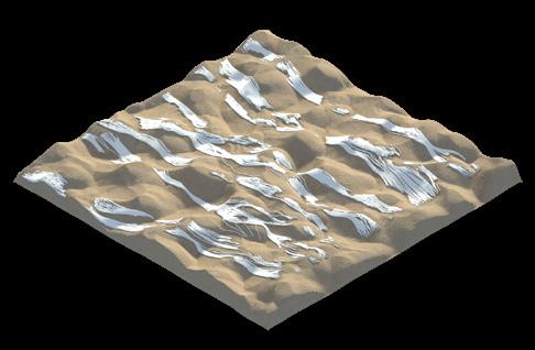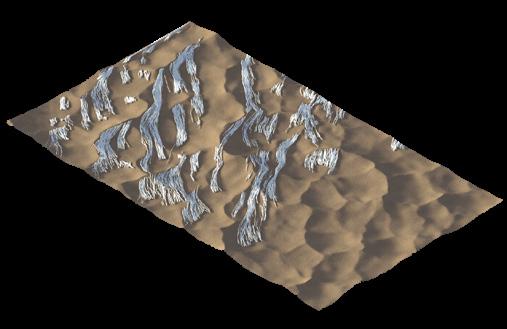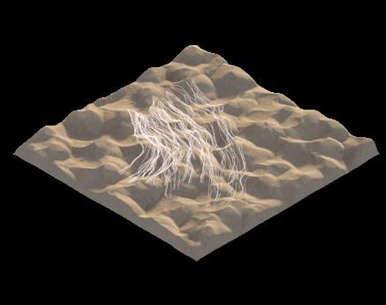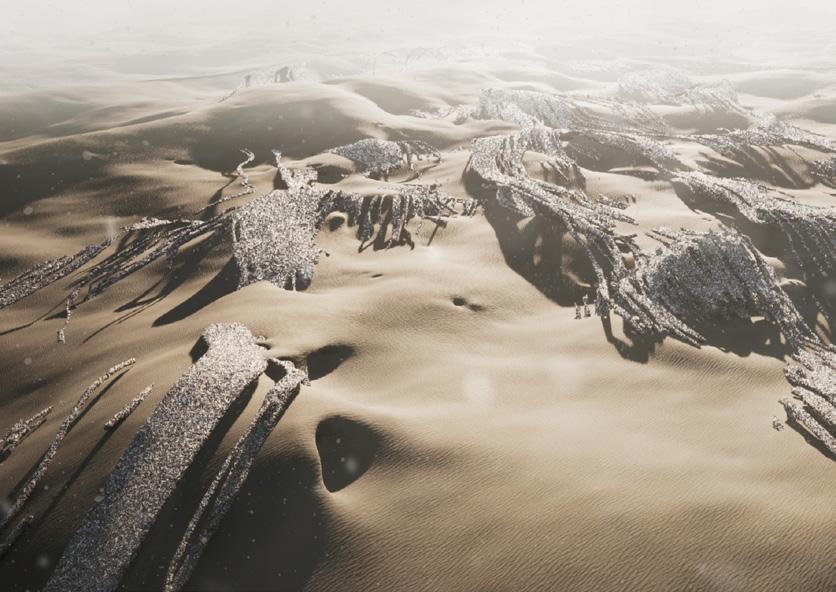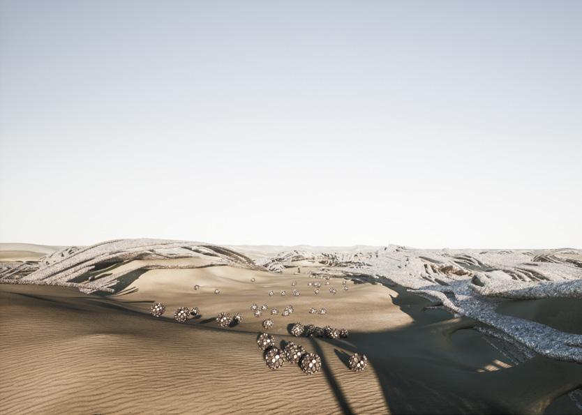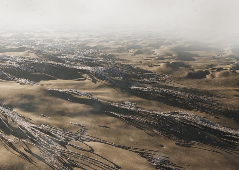 The agents are programmed to be autonomous in the decision making of on-site fabrication, the trajectory of movement, and collaborative production. The network of movement is logistically simulated according to the local data and satellite imagine. This network is constantly changing with the movement of dunes and alterations to the landscape, creating a one-to-one dialogue between agents and the dynamic landscape.