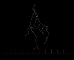 The simulation was done as research on lightning formation. The field of points was charged to be amplifying upwards. Then the points were randomised in a certain radius to have a random charged field of points but in general with an increasing charge upwards. The process of lightning starts from one point on the top and finds the points with the lowest charge in a certain radius. It can select several points to move on and thus the branching occurs. A branch can stop developing if it will not find a smaller charge.
