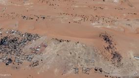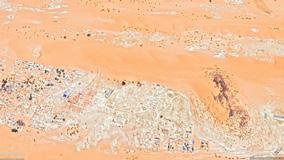 Desert refugees; Sahara Desert, Africa; The light colored rock bed above the shoreline indicates the decreased water levels of the reservoir