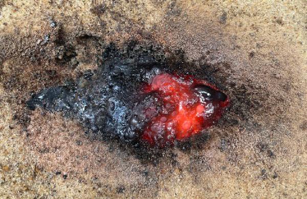 When lightning strikes the ground, it is hot enough to fuse silica sand and clay together into fulgurites: shafts of glass produced by lightning. The word fulgurite comes from fulgur, the Latin word for thunderbolt. Glass can be made by heating sand, which is mostly silicon dioxide, or quartz. The lightning bolt vaporizes the sand it encounters, generating a hollow tube. As the heat moves outward from the entry hole, the sand grains melt and form a smooth inner surface. As the heat moves further outward, it fuses grains of sand. The outside is rough, looking like petrified lightning when the fulgurite has branching assemblages. But the inside is hollow and smooth. The composition of the sand determines the colour of the fulgurite.