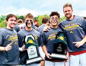 University of Utah Lacrosse teammates, Seamus McCarthy ’22, Conor O’Neill ’21, Trey Akabane ’21, and Zach Chandler ’17 celebrated after winning the ASUN Championship in May 2023.