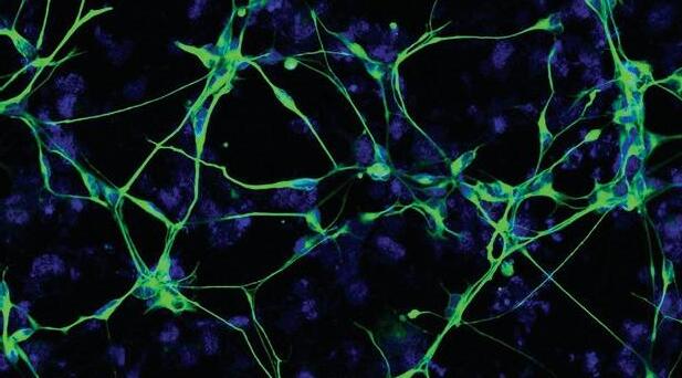 Neurons (green) derived from a patient with Alzheimer’s disease. The nuclei (blue) of the neurons are also shown.
