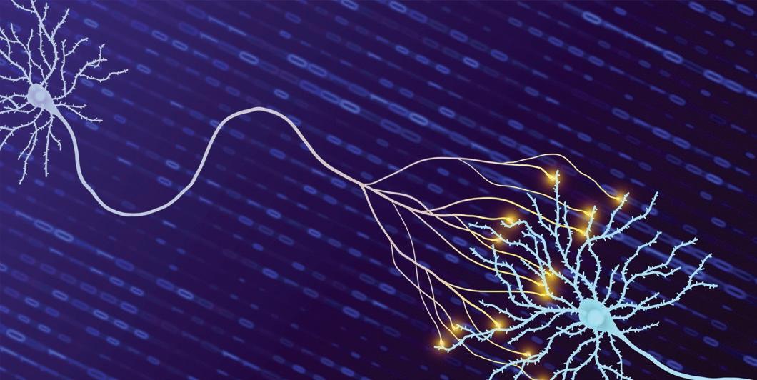 A neuron (left) sends a message to another neuron (right) through electrochemical signals, represented by flashes of yellow at the points where the two cells meet, called synapses.