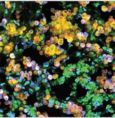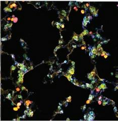 Lung adenocarcinoma tumor cells (green) and macrophages (red) accumulate in the lungs of control mice (left), but expansion of the tumor cells is hindered in macrophage PPARγ knockout mice (right), since the macrophages can’t be metabolically co-opted by tumor cells. Cellular cholesterol is visualized in yellow.