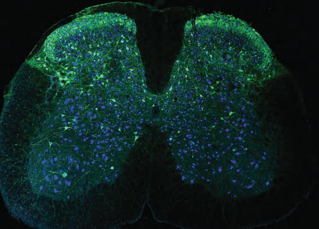 Above: Neurons in the spinal cord (blue), including those that send signals about pain (green), captured using one of the new wearable microscopes.