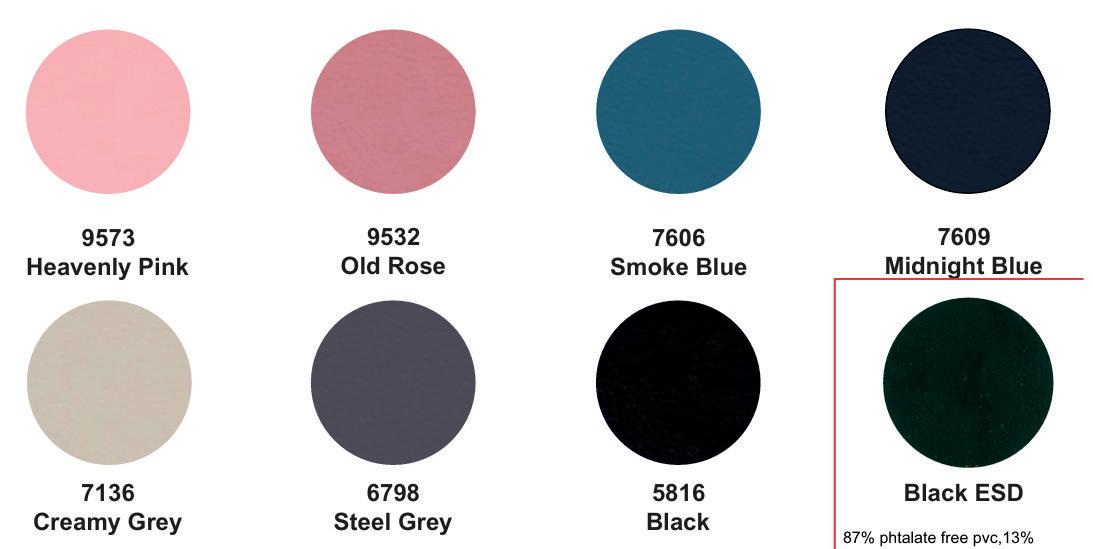 Salli stole fås med flere forskellige slags betræk svarende til de særlige behov ved forskellige opgaver. Til normal kontorbrug anbefaler vi det åndbare og slidstærke ægte læder og til laboratorier det desinficerbare kunstlæder. Til særlige industrielle behov har vi gnist- og fugtsikre sædedækkener. De antistatiske ESD-materialer er bedst egnede til elektronikindustrien.