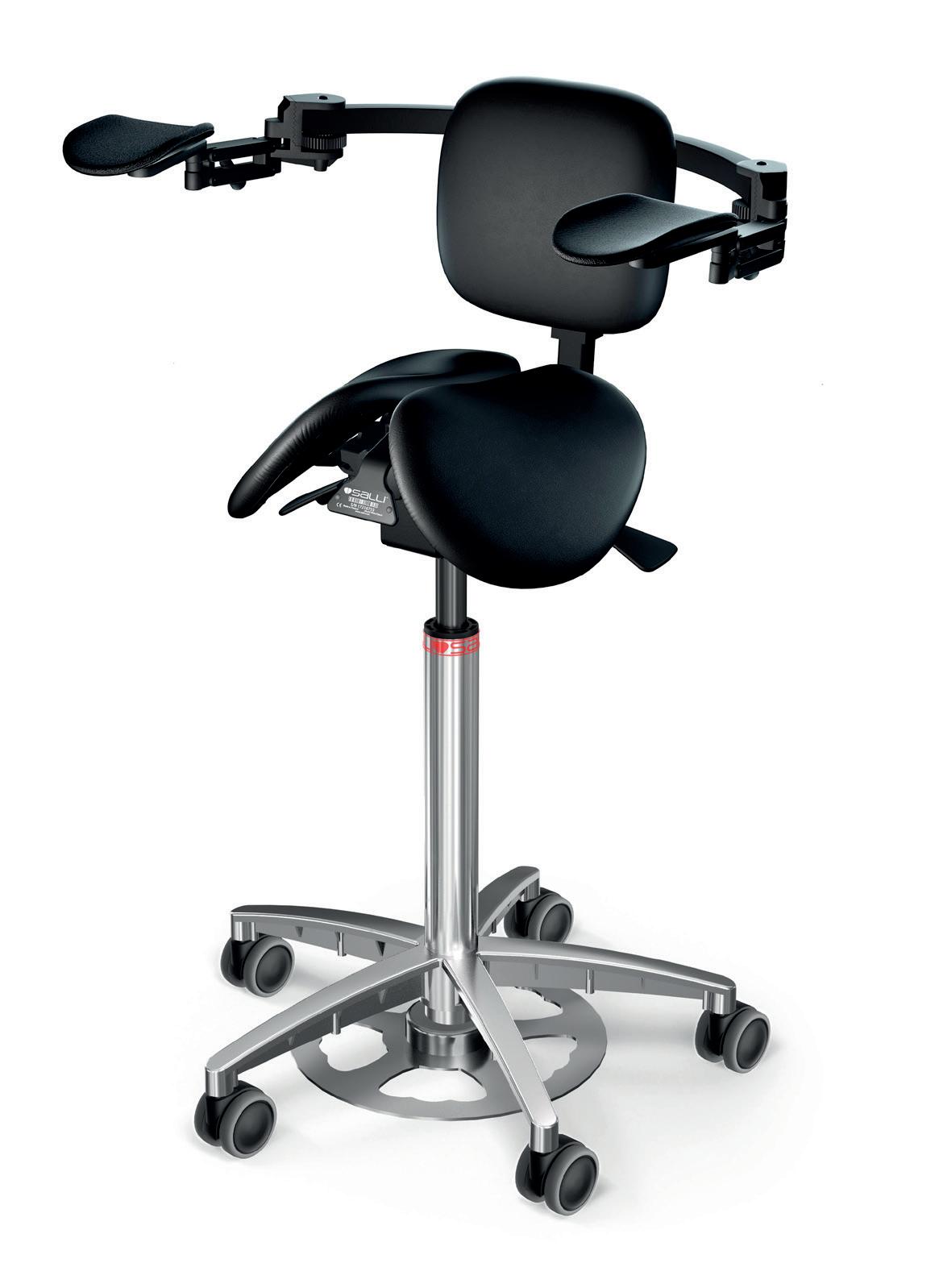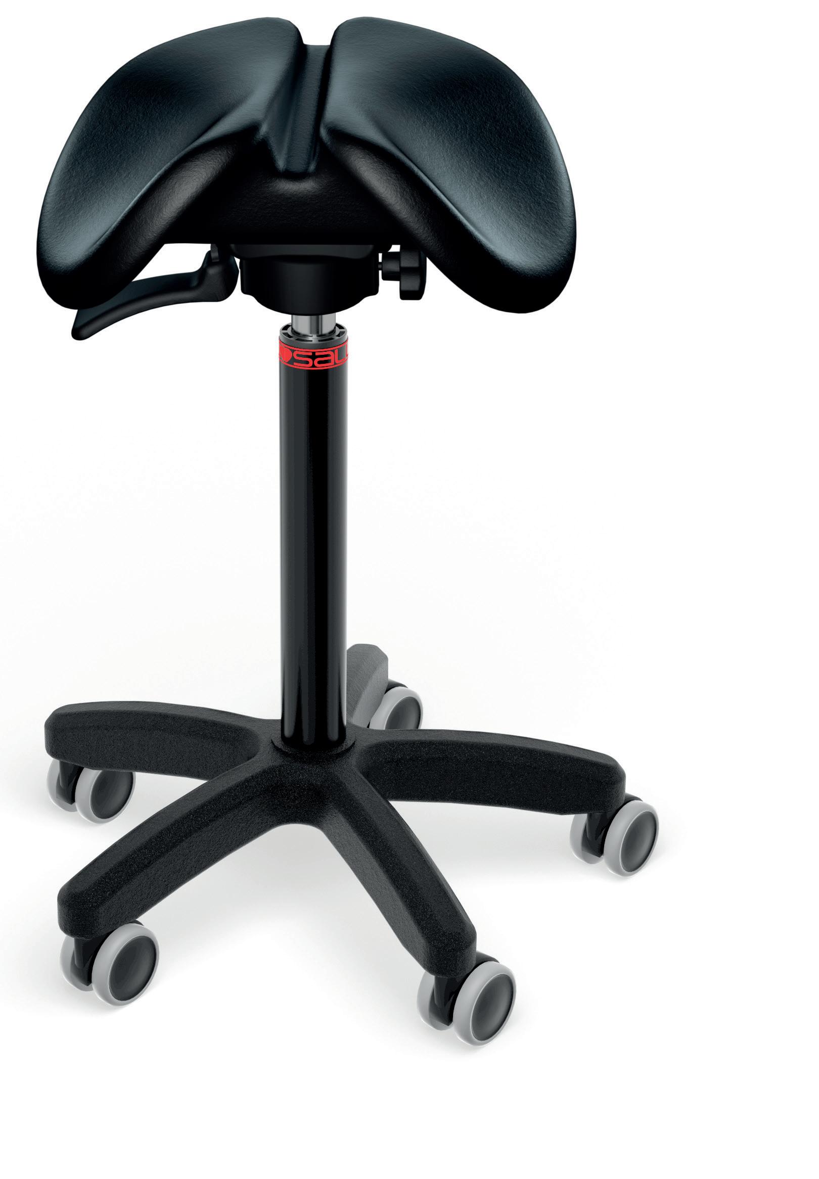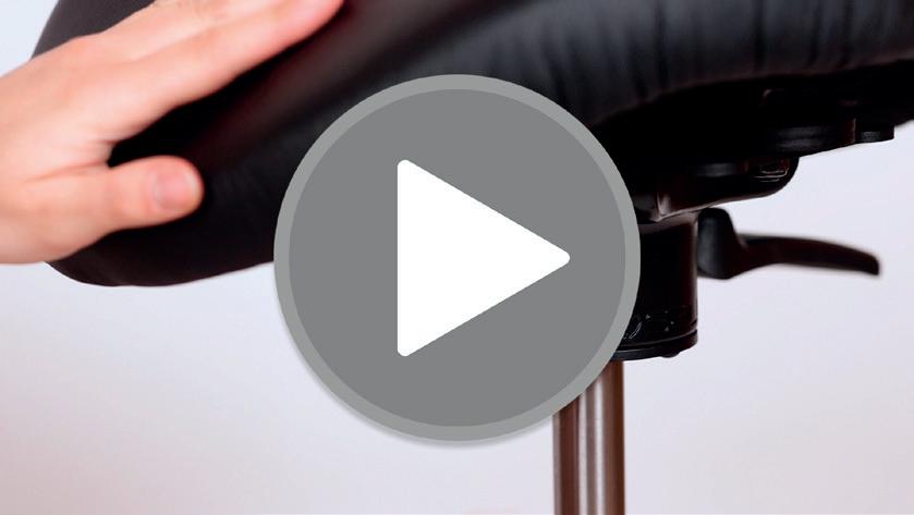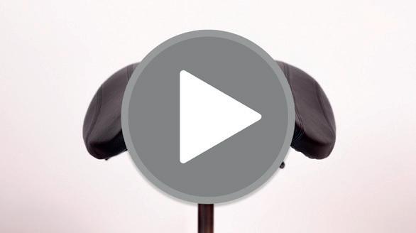 På den ergonomisk utformede, todelte sadelstolen kan du sitte i en semioppreist, aktiv og balansert stilling. Vinkelen og formen på setet leder bekkenet til å dreie fremover. I denne posisjonen støtter ryggraden overkroppen og musklene forblir avslappet.
