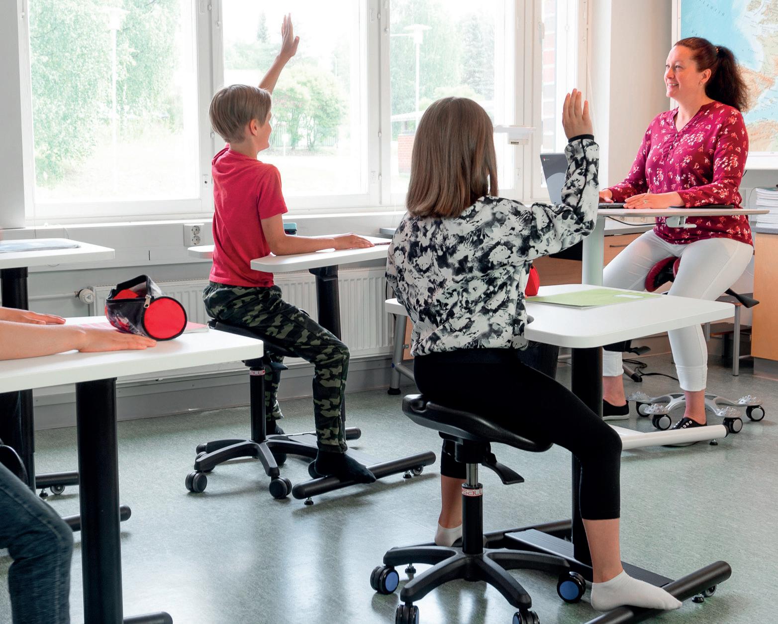 Man sitter högre på en sadelstol än på en traditionell stol, vilket fungerar utmärkt framför en klass eller en grupp. Möjligheten för elever och studenter att individuellt ställa in bord och stolar ökar ergonomin avsevärt. Ergonomin spelar en stor roll när det gäller att minska smärta och värk, förbättra hållningen och behålla en god rygghälsa generellt. Rastlösheten minskar eftersom hållningen är neutral och bekväm. God hållning i skolan betyder friska ryggar i framtiden!