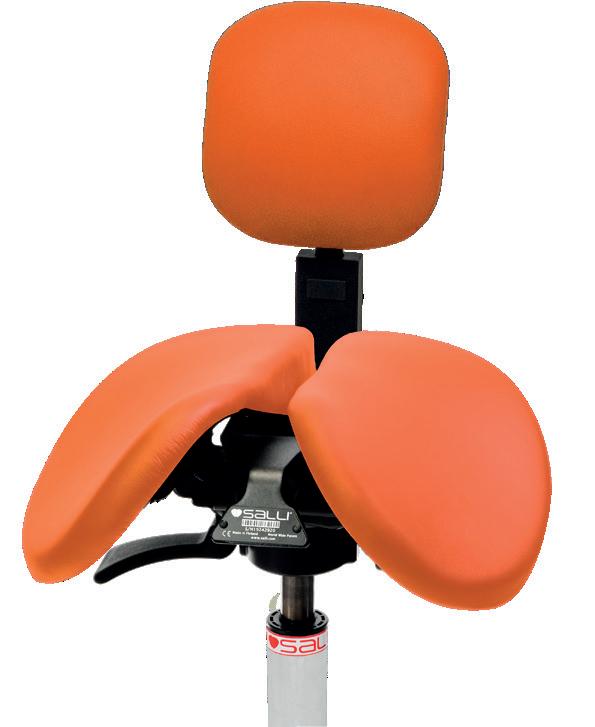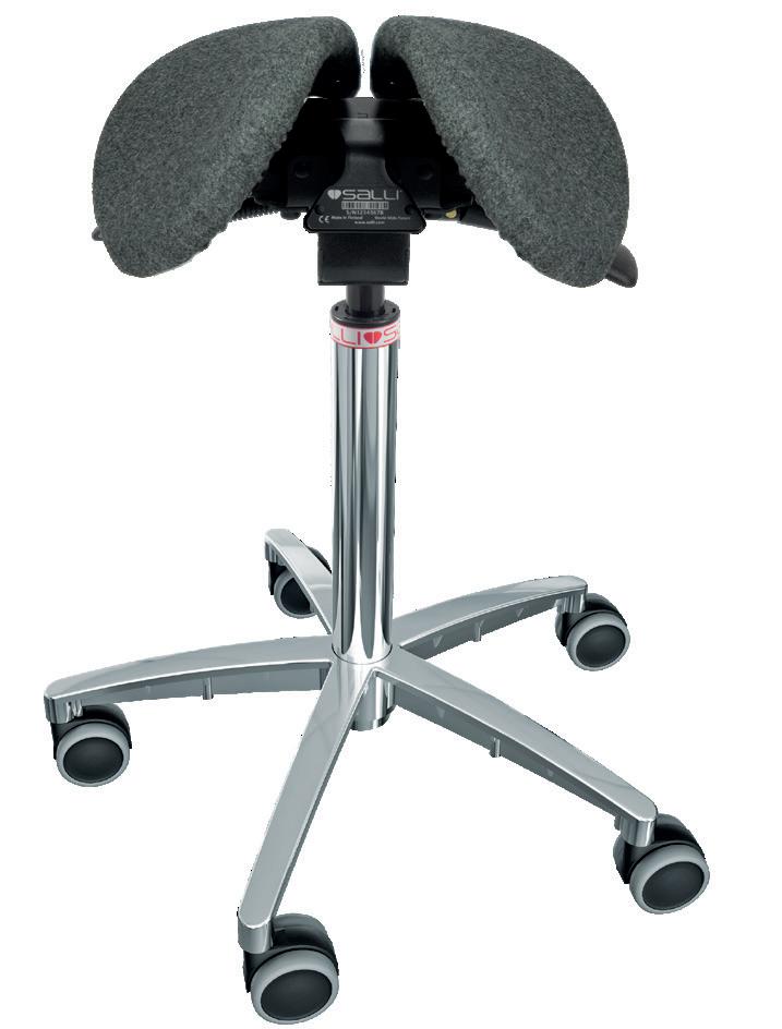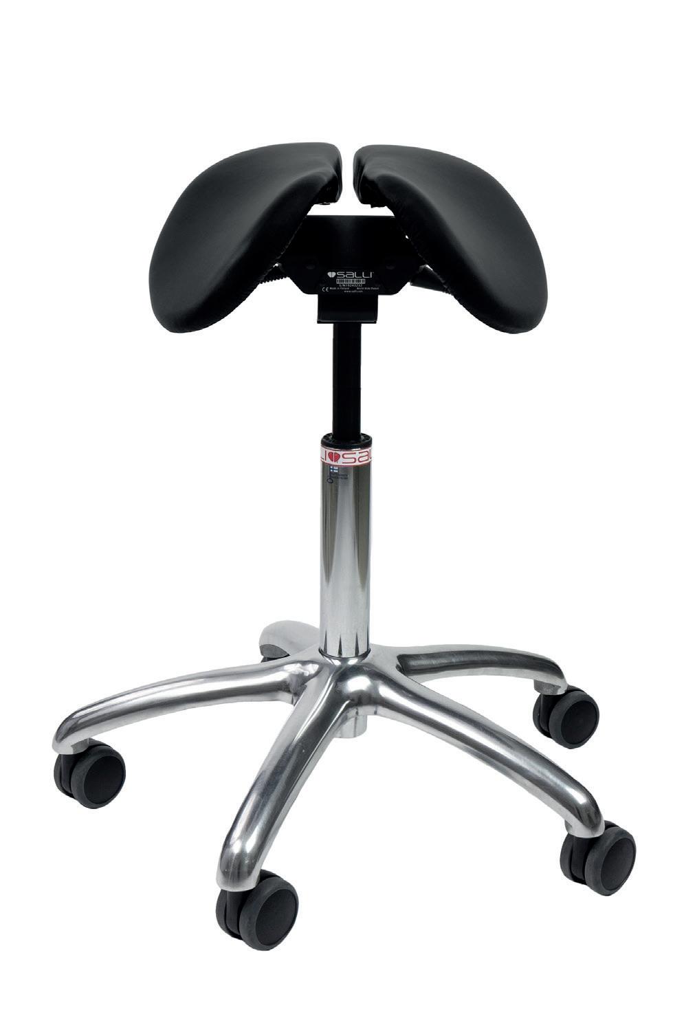 Det är lätt att ta sig runt på en Salli sadelstol, med den 135-gradiga vinkeln i knäna och mellan lår och överkropp, garanteras en god cirkulation. Genom den delade sitsen är det möjligt att bibehålla den goda hållningen hela dagen, då det inte fi nns något obehagligt tryck i underlivet.