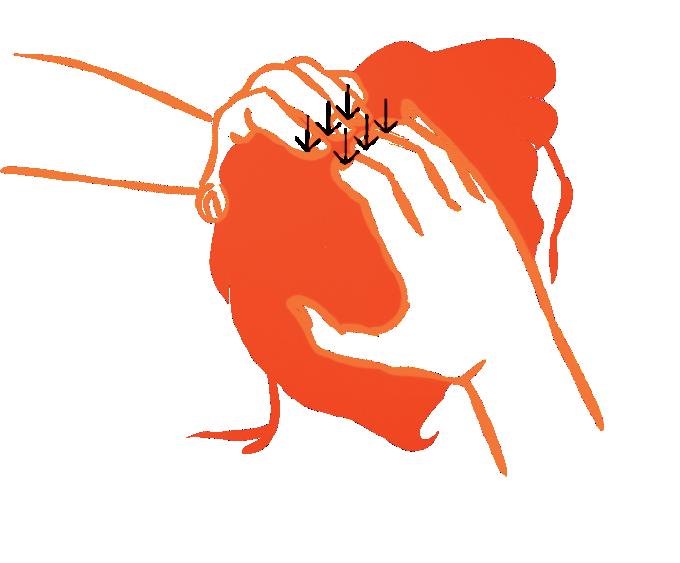 Soutenir la partie supérieure de la tête avec une main et utiliser l’autre main pour appuyer sur l’axe central avec l’index, le majeur et l’annulaire, à partir de la nuque jusqu’au sommet de la tête. Placer la partie supérieure de la tête dans les paumes pour la soutenir tout en créant des pressions avec les trois doigts des deux mains.
