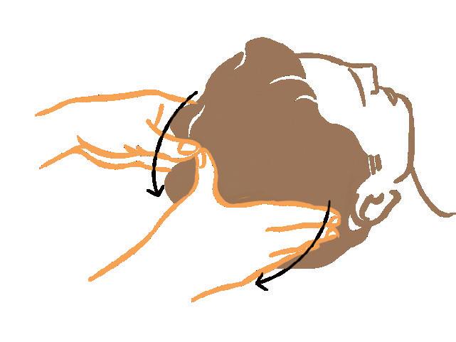 Du bout des doigts des deux mains, ouvertes, souples et opposées, effectuer des mouvements circulaires en exerçant une pression moyenne et alternée, d’abord sur les côtés, puis sur l’avant et l’arrière. Sur la zone occipitale ce sont les pouces qui travaillent.