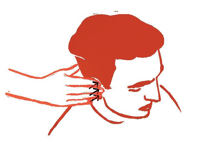 Du bout des pouces, saisir les fossettes occipitales sur les côtés de la ligne médiane et dessiner 9 petits cercles vers l’intérieur et 9 vers l’extérieur en exerçant une pression douce. Tenir fermement la position avec les doigts en soutenant la tête avec les mains et en maintenant le cou bien droit.