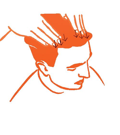 Les bouts des doigts des deux mains, ouvertes, souples et opposées, glissent sous les cheveux en les soulevant. Effectuer des mouvements circulaires sur toute la tête jusqu’à ce que le cuir chevelu soit entièrement couvert de produit.
