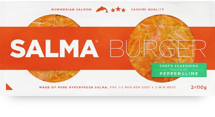 4 porsjoner 2O minEn premium lakseburger som består av ren SALMA® oppskåret i biter med en mild smak av pepper og lime