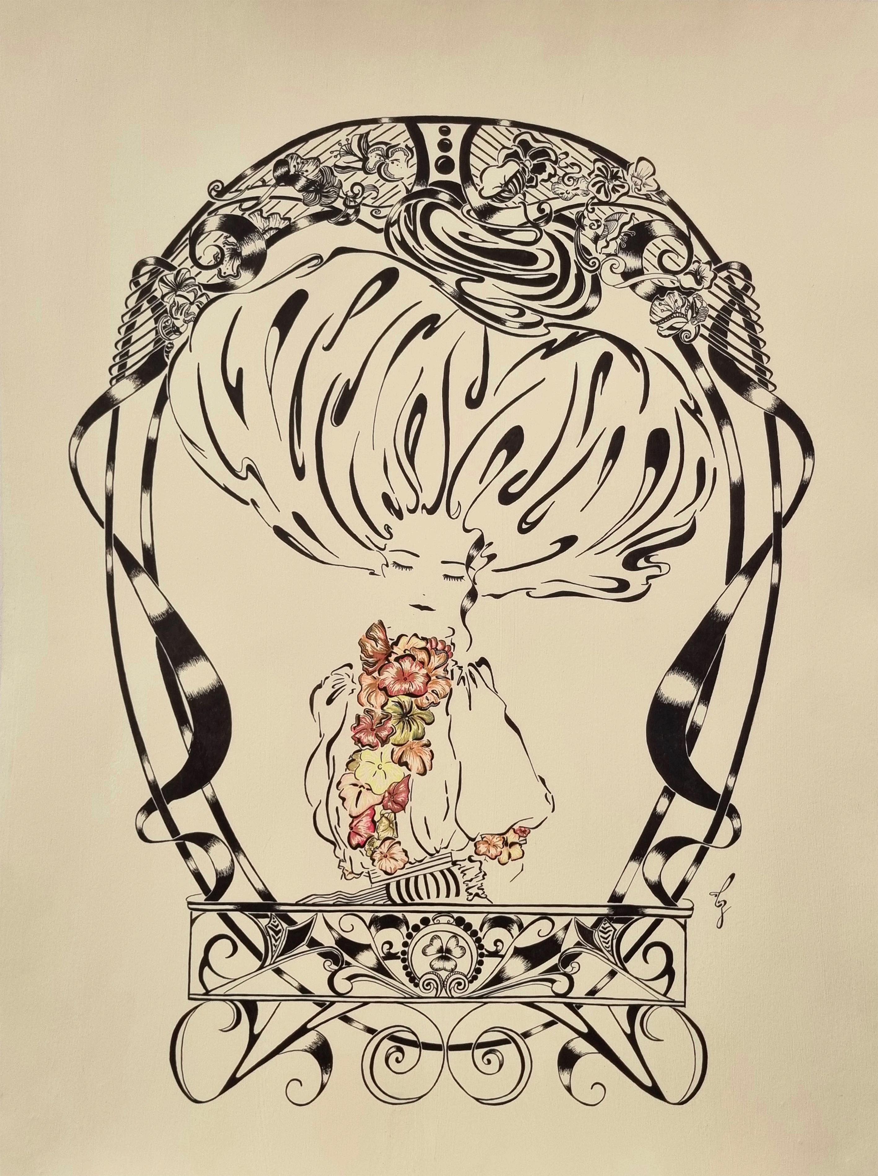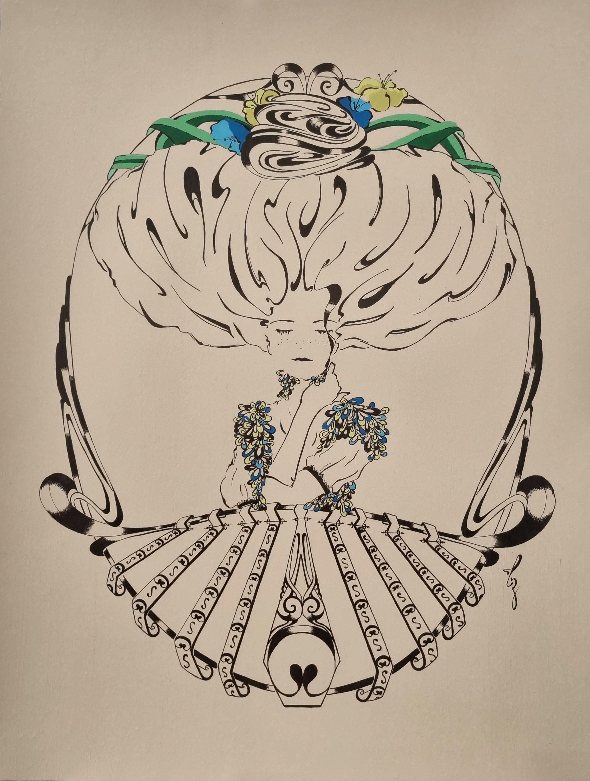 "Arabesque Femininity" is an exhibition that embodies Lylas's unique artistic vision, where Belle Époque elegance meets Art Nouveau creativity. The collection features intricate portraits that weave together the historical allure of the Belle Époque with the ornamental richness of Art Nouveau. Lylas's pieces explore the essence of femininity through delicate arabesques and lush floral motifs, capturing the grace and complexity of the female form in a dance of line and color.
