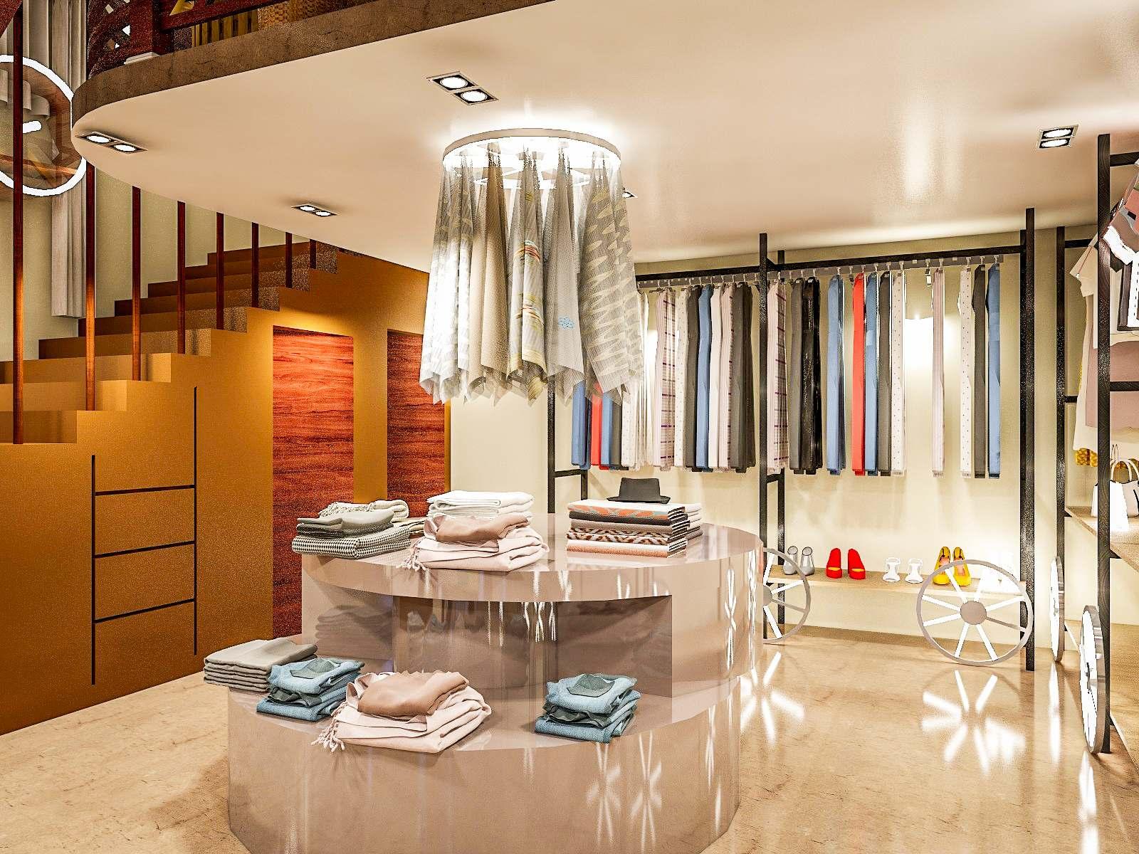 A wooden saree wheel at the center is the main point of attraction which makes the maximum use of height. The space below the mezzanine floor has been used for women’s clothing and apparel display. A scarf wheel on the ceiling has been proposed to give a unique wheel display. Space below the staircase has been used for trial rooms and storage purpose.