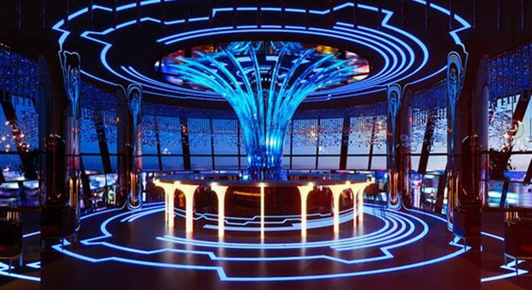 The mezzanine floor has been surrounded by wooden grills and dedicated for people who come for dining. The furniture used here are again the hues of Grey and Green to keep a sync in complete interior. The dance floor has a mirror floor with small lights hung all over the ceiling. The reflection creates a mood while dancing to enjoy.