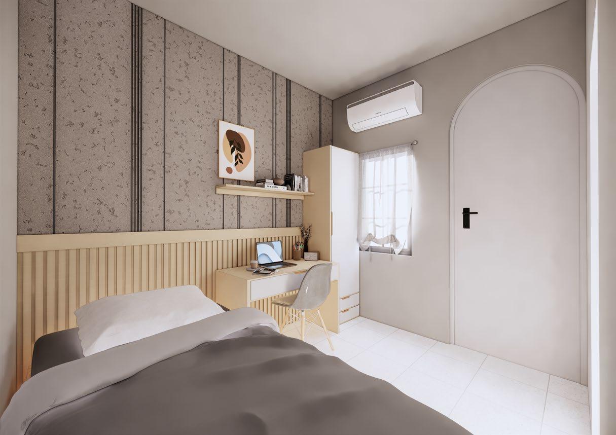 Desain kamar bergaya minimalis dengan unsur warna yang rileks dan hangat , dan juga tambahan elemen elemen tambahan yang bernuansa natural seperti kayu