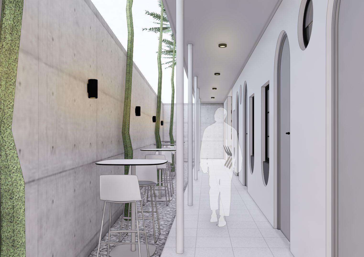 Koridor bagi penghuni di tiap lantainya. memiliki konsep terbuka yang memanfaatkan sirkulasi udara dan pencahayaan alami langsung.
