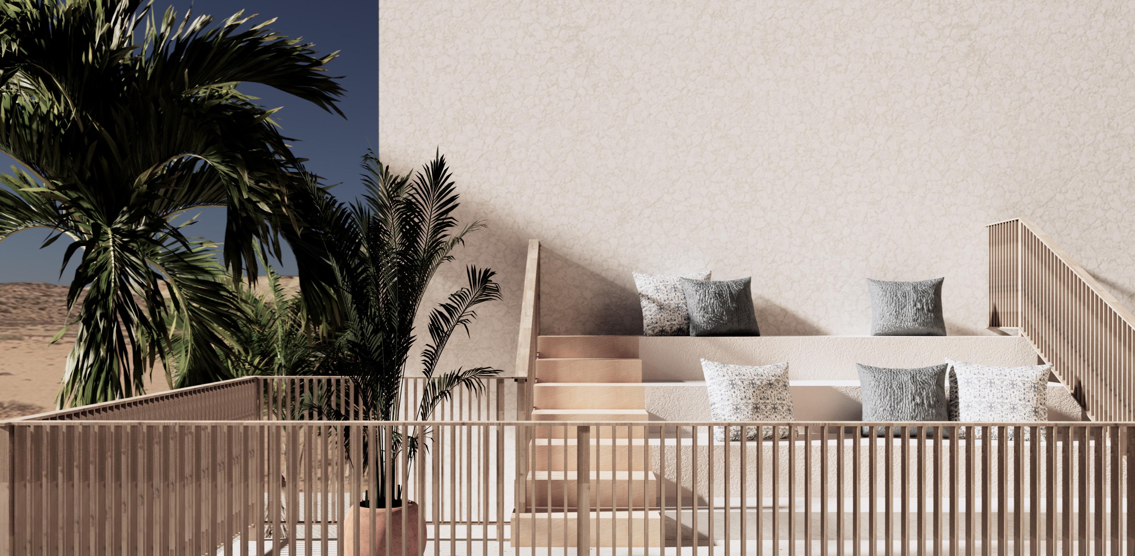 The combination of white stucco walls with rattan, wood, natural stone tiles, and coconut trees gives us memories of the beach.
