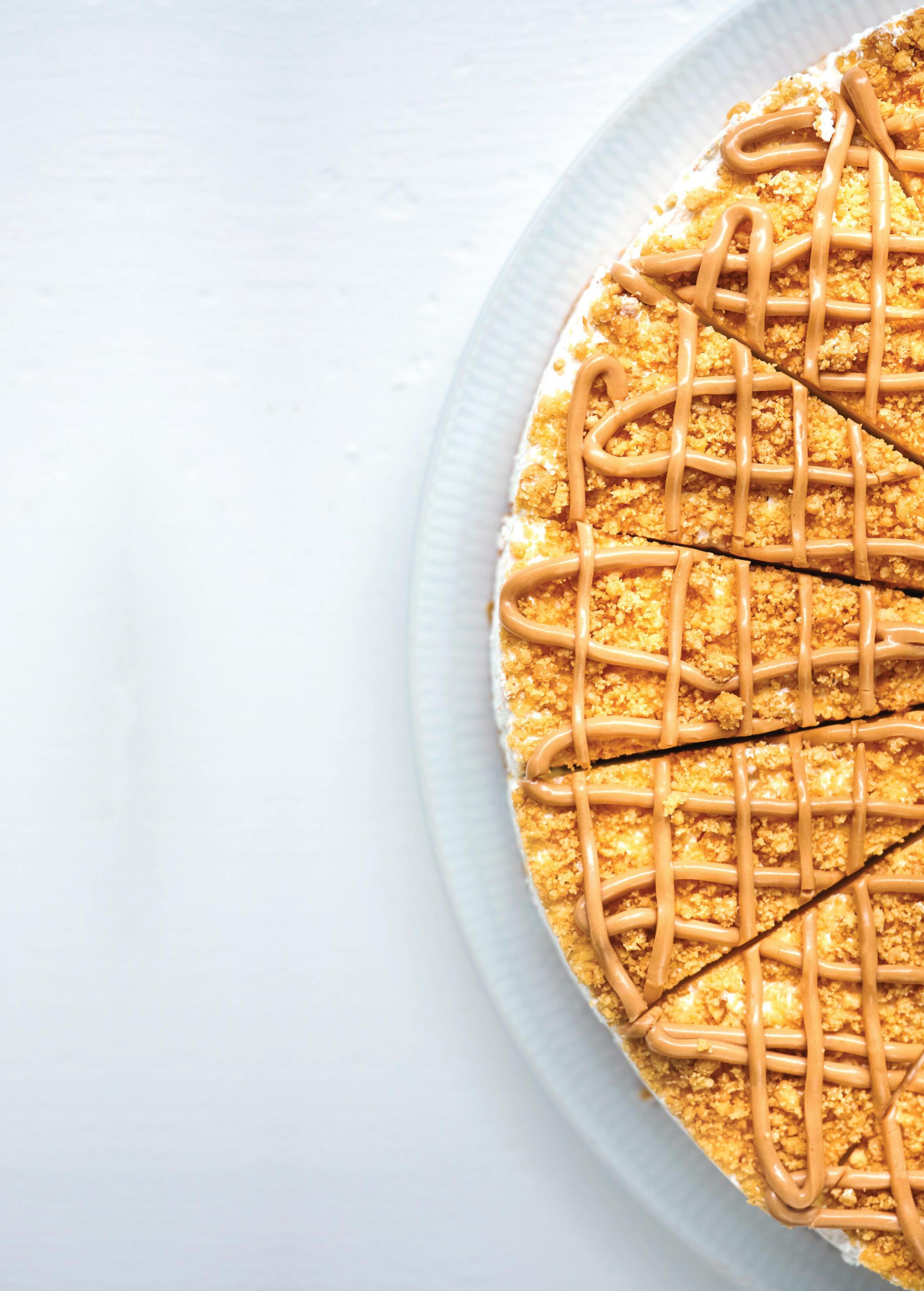 This lovely dessert can be served in slices thanks to its solid base which is topped with a generous layer of toffee plus fresh dairy cream flecked with chunks of golden baked meringue. We finish the entire confection by showering it with caramel curls. Yum.