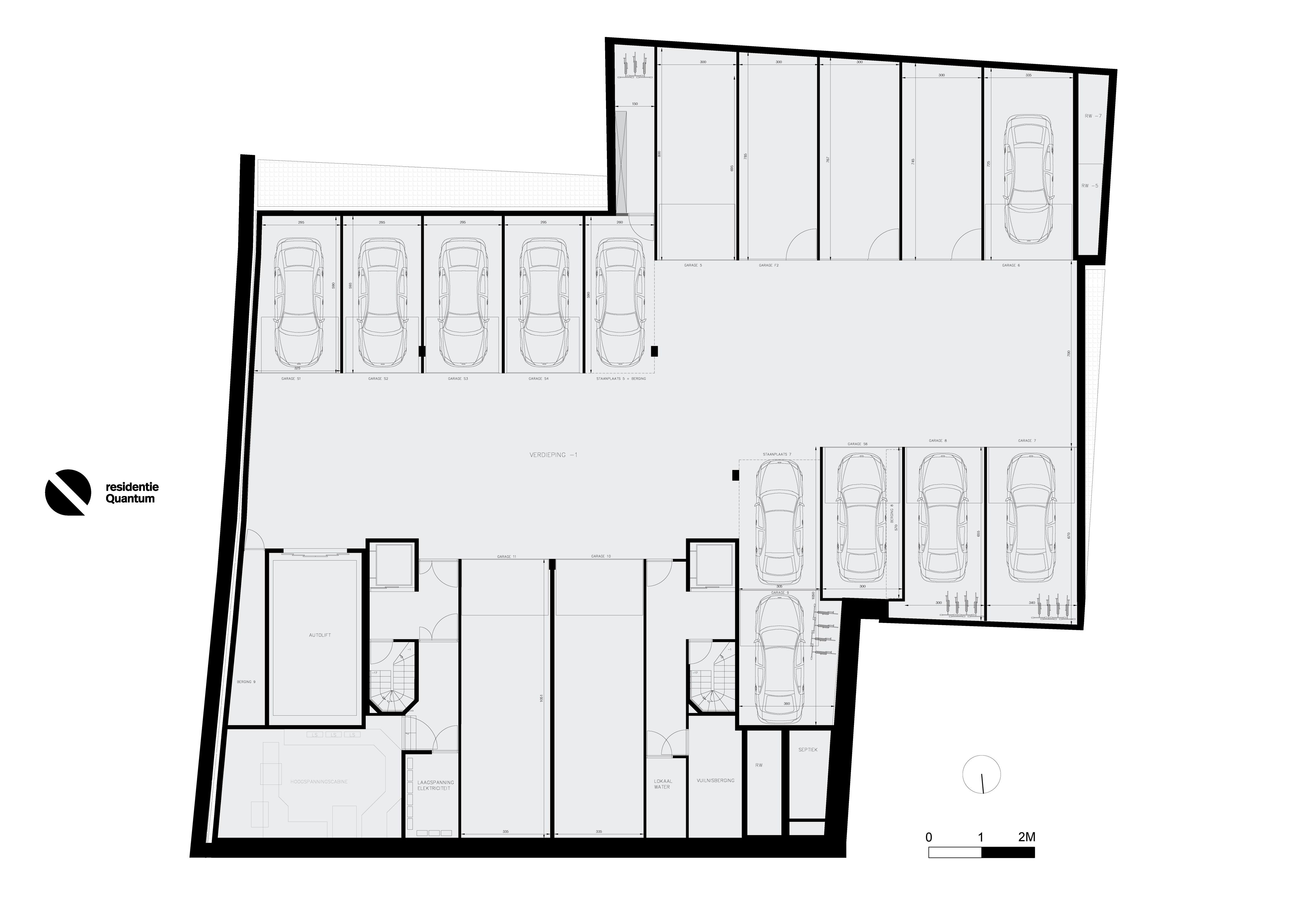 De residentie beschikt over twee ondergrondse parkeerniveaus, voornamelijk ingericht met individuele garages en aangevuld met autostaanplaatsen, fietsplaatsen, private bergingen en technische lokalen. De in- en uitrit verloopt via een ruime autolift en is rechtstreeks geïntegreerd in de Knokkestraat. Een uitzonderlijk privilege dat bijdraagt tot het dagelijkse gebruiksgemak van de bewoners.