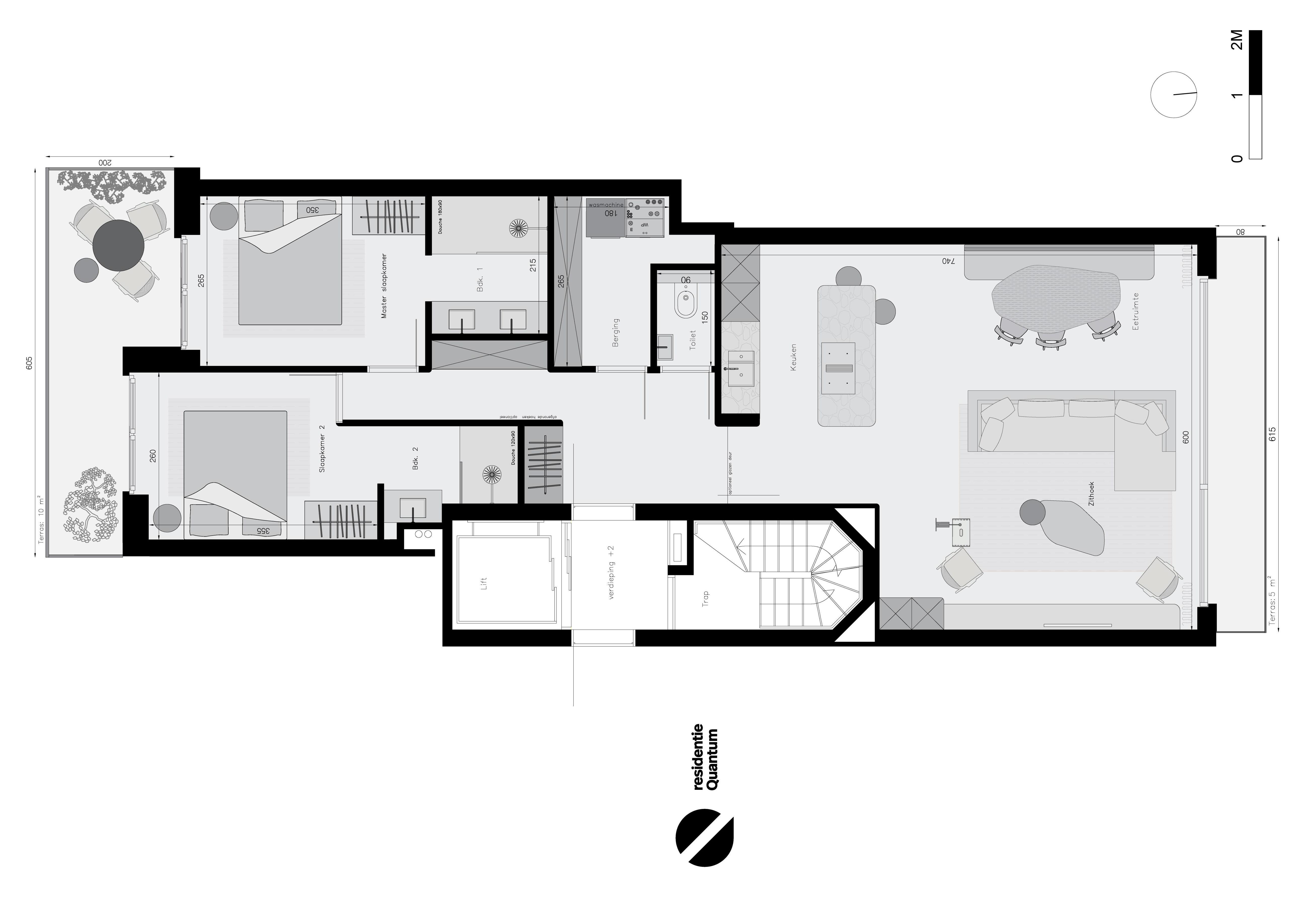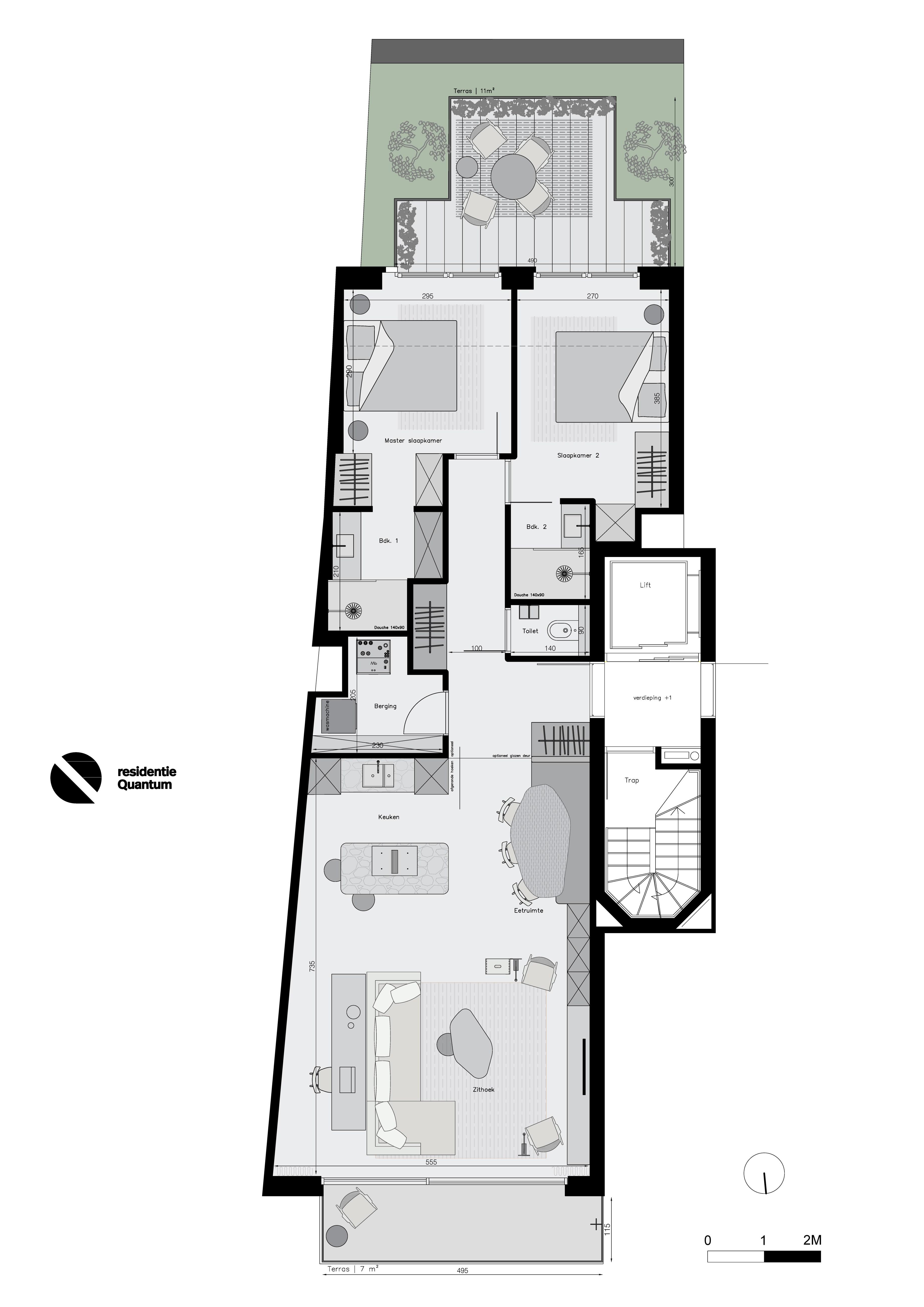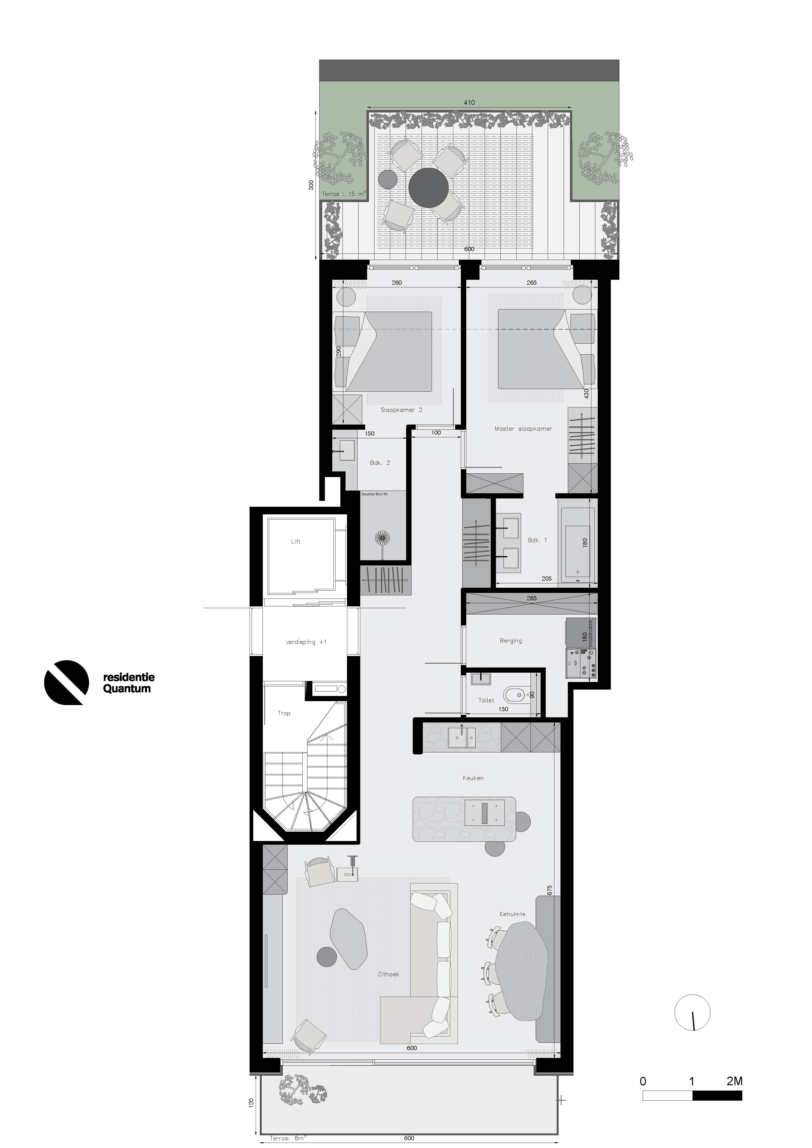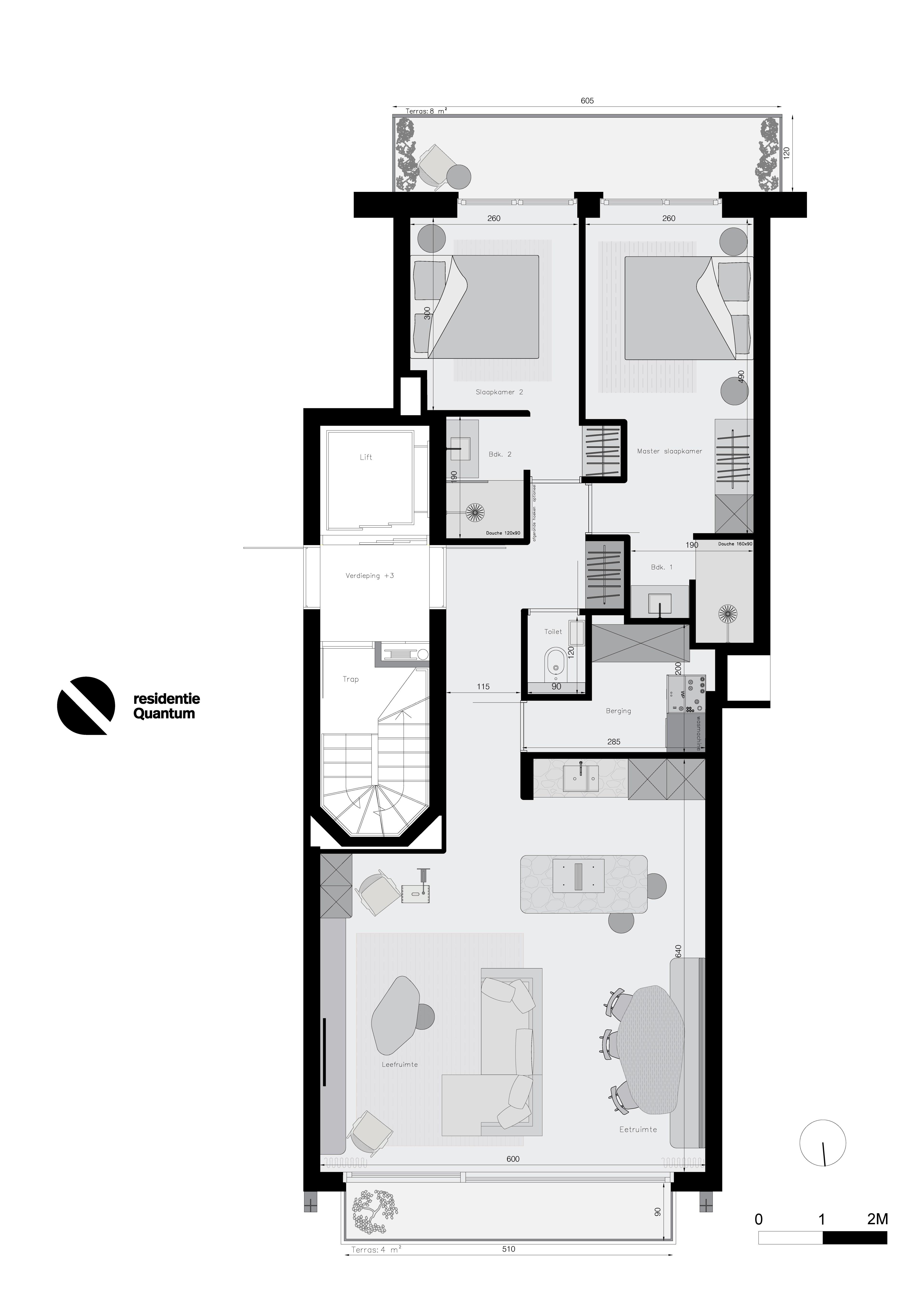 Bovengronds telt Quantum vier appartementen per verdieping, verspreid over vier woonlagen. Elk appartement is doordacht ingedeeld en beschikt over twee ruime slaapkamers, waarbij daglicht niet alleen functioneel is, maar ook rust brengt in het dagelijkse leven.