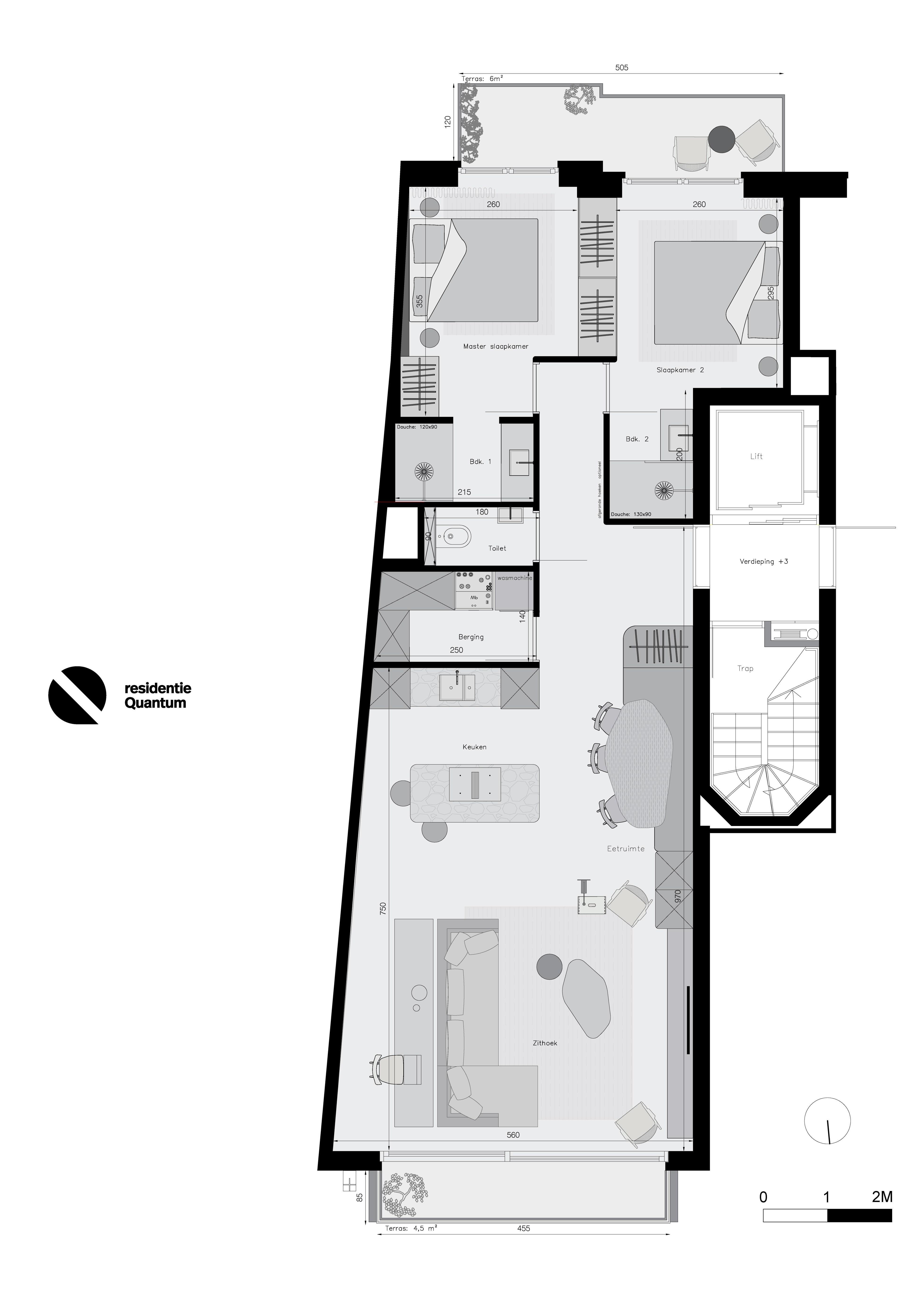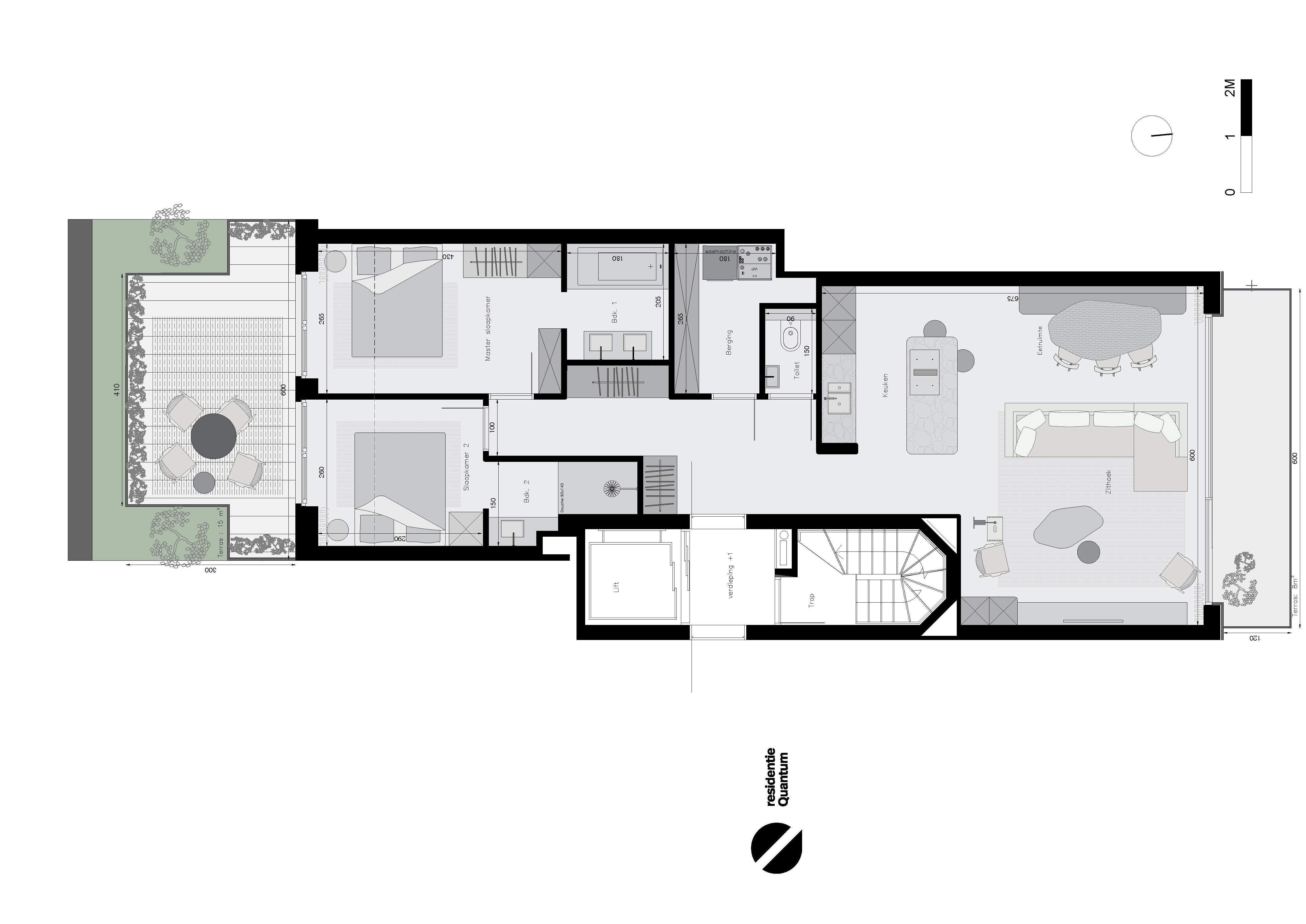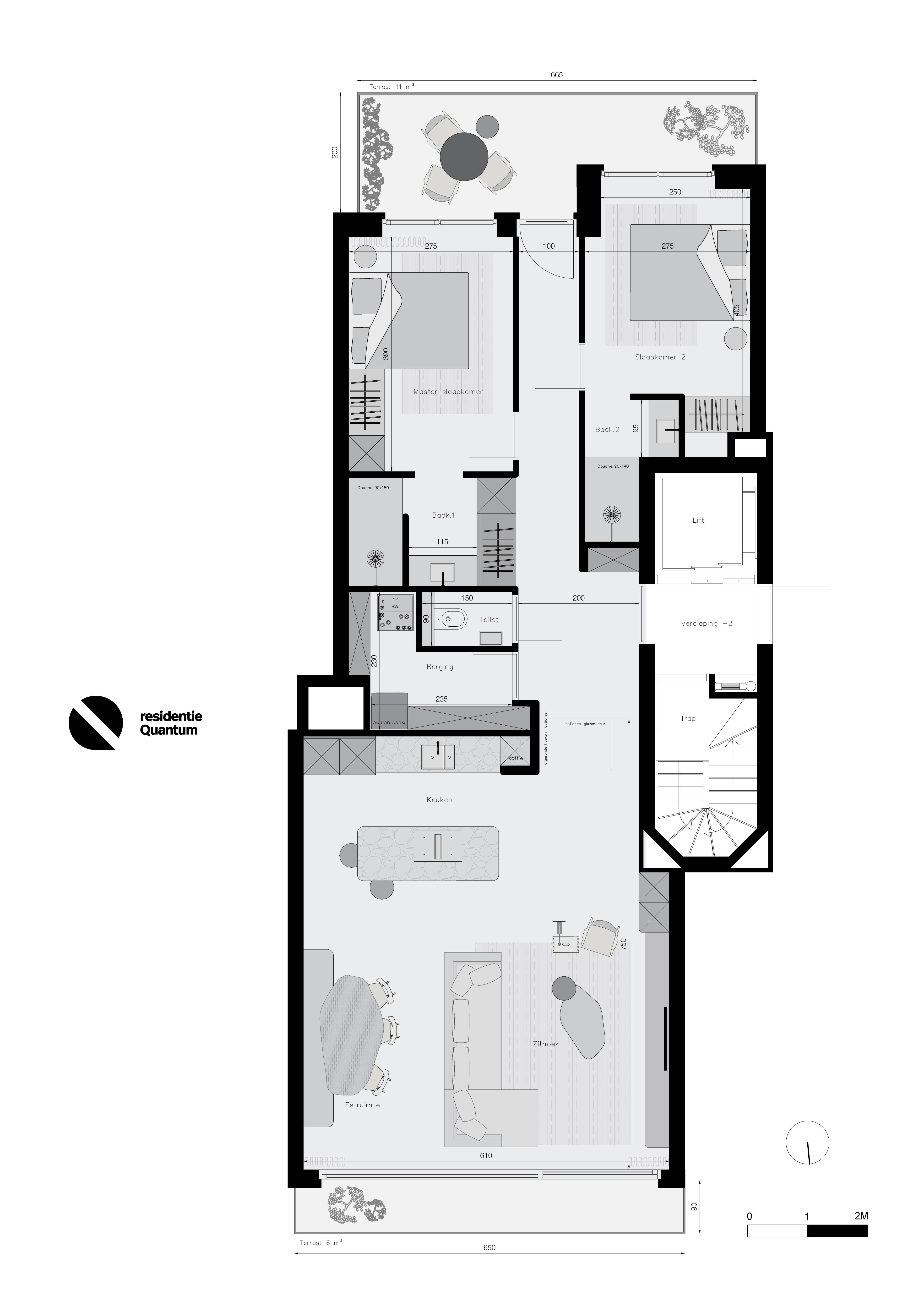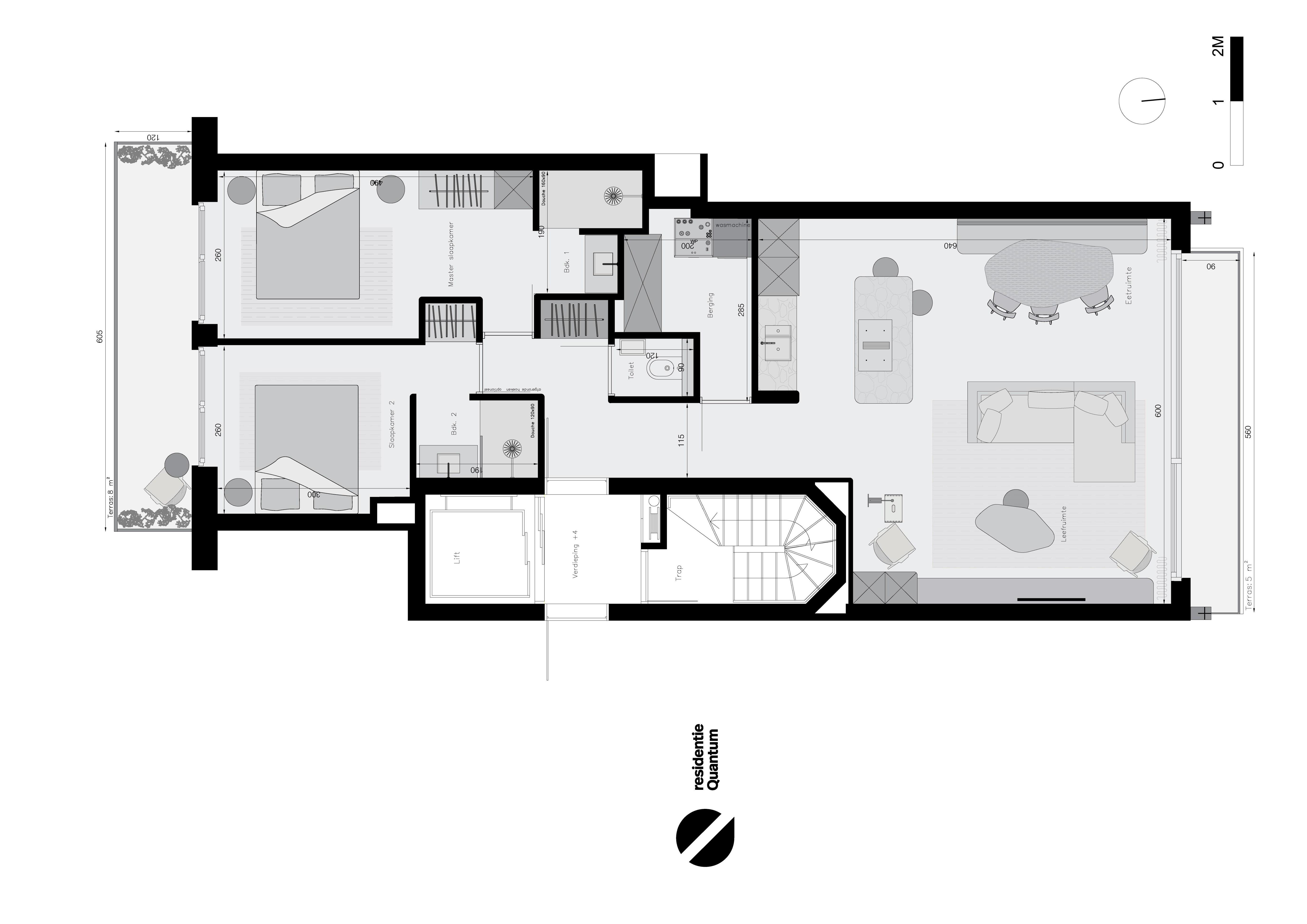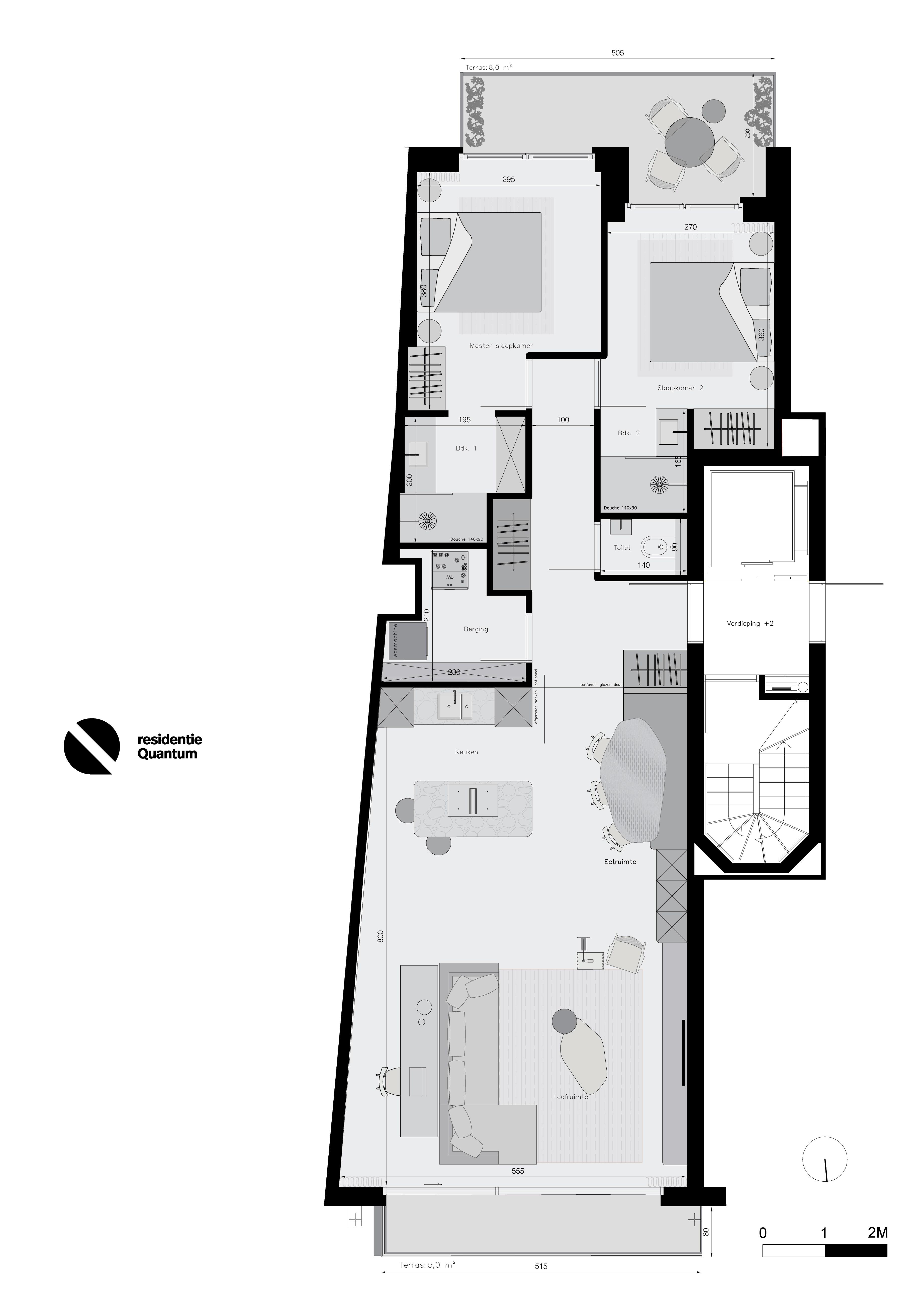 Bovengronds telt Quantum vier appartementen per verdieping, verspreid over vier woonlagen. Elk appartement is doordacht ingedeeld en beschikt over twee ruime slaapkamers, waarbij daglicht niet alleen functioneel is, maar ook rust brengt in het dagelijkse leven.