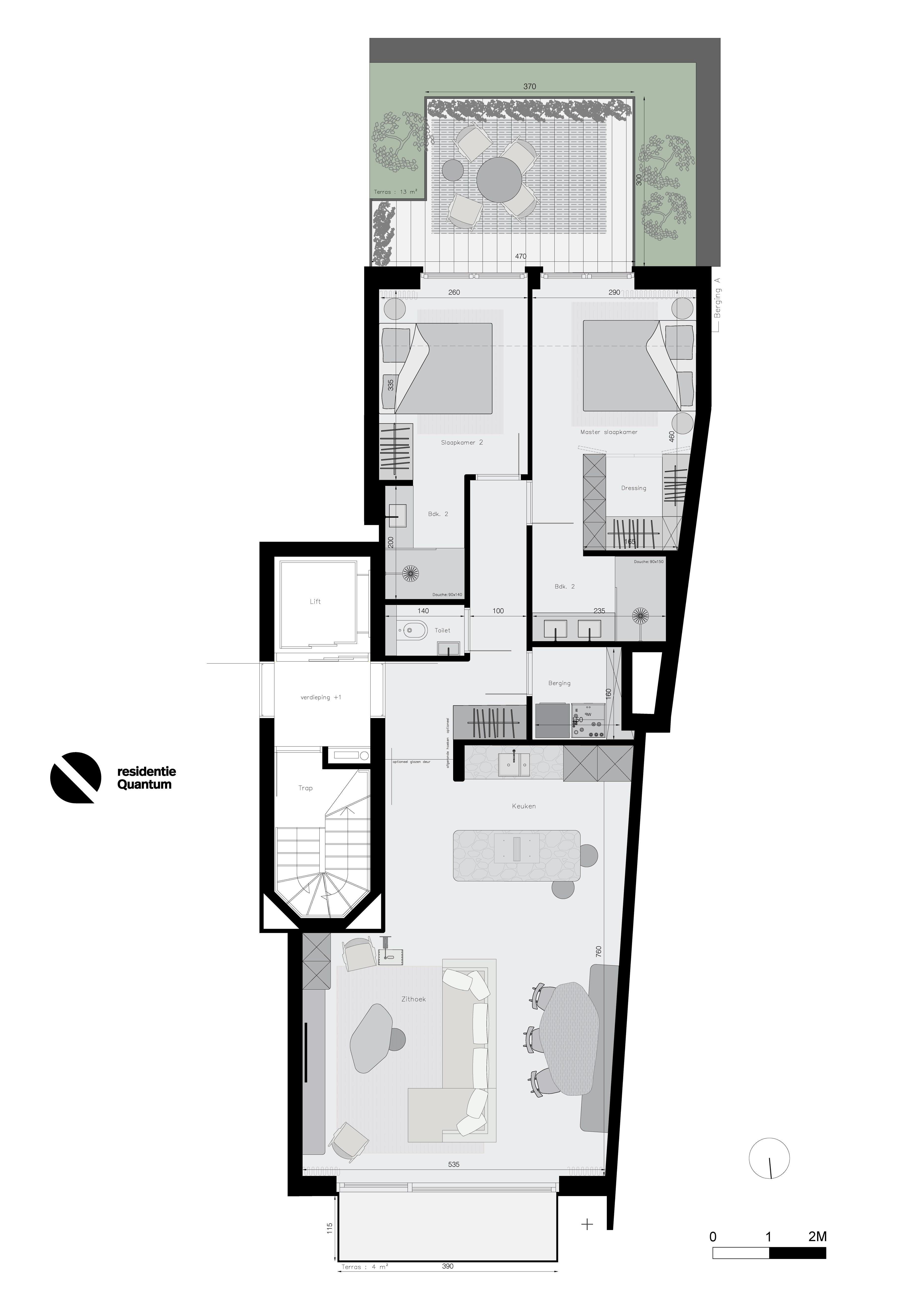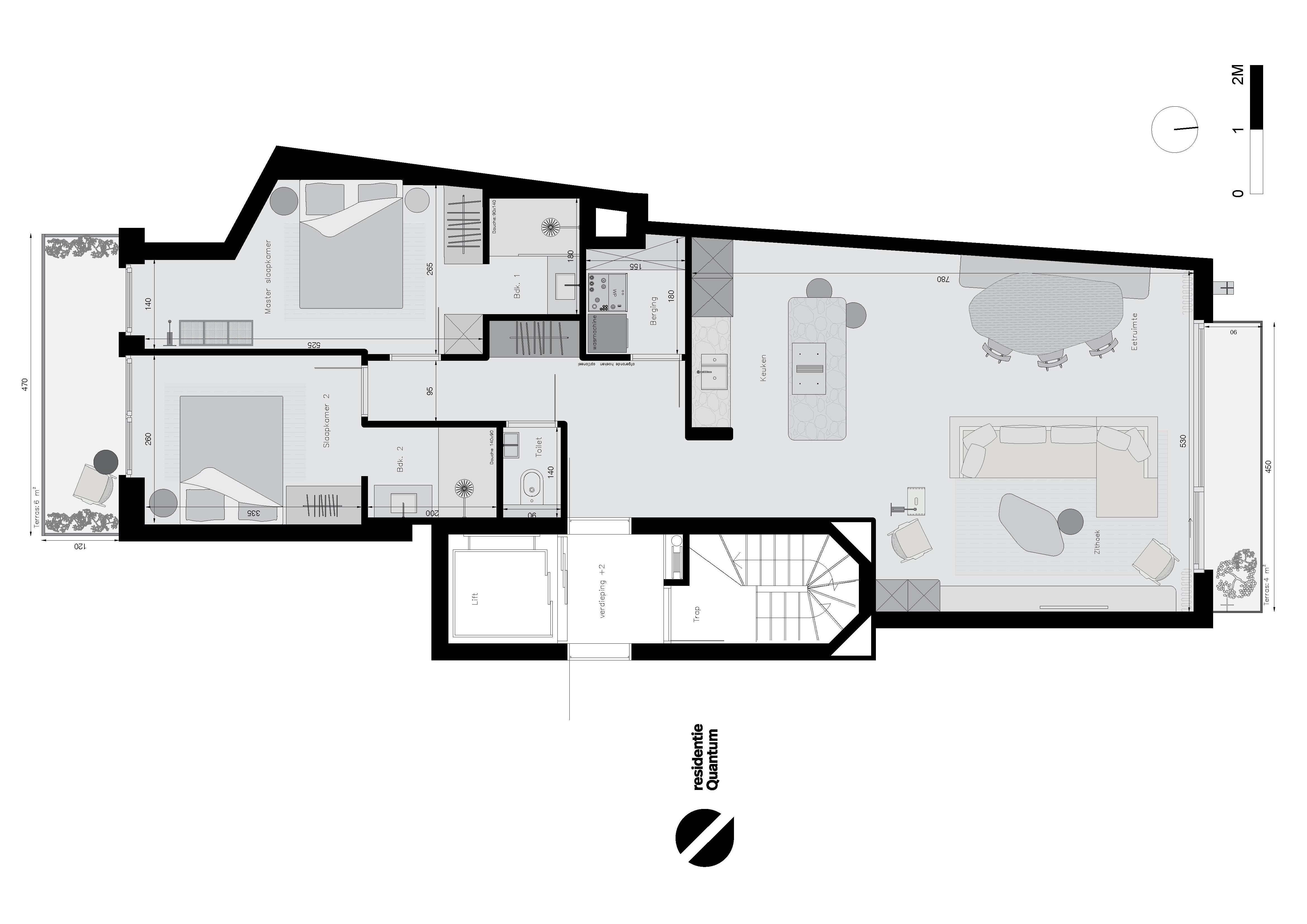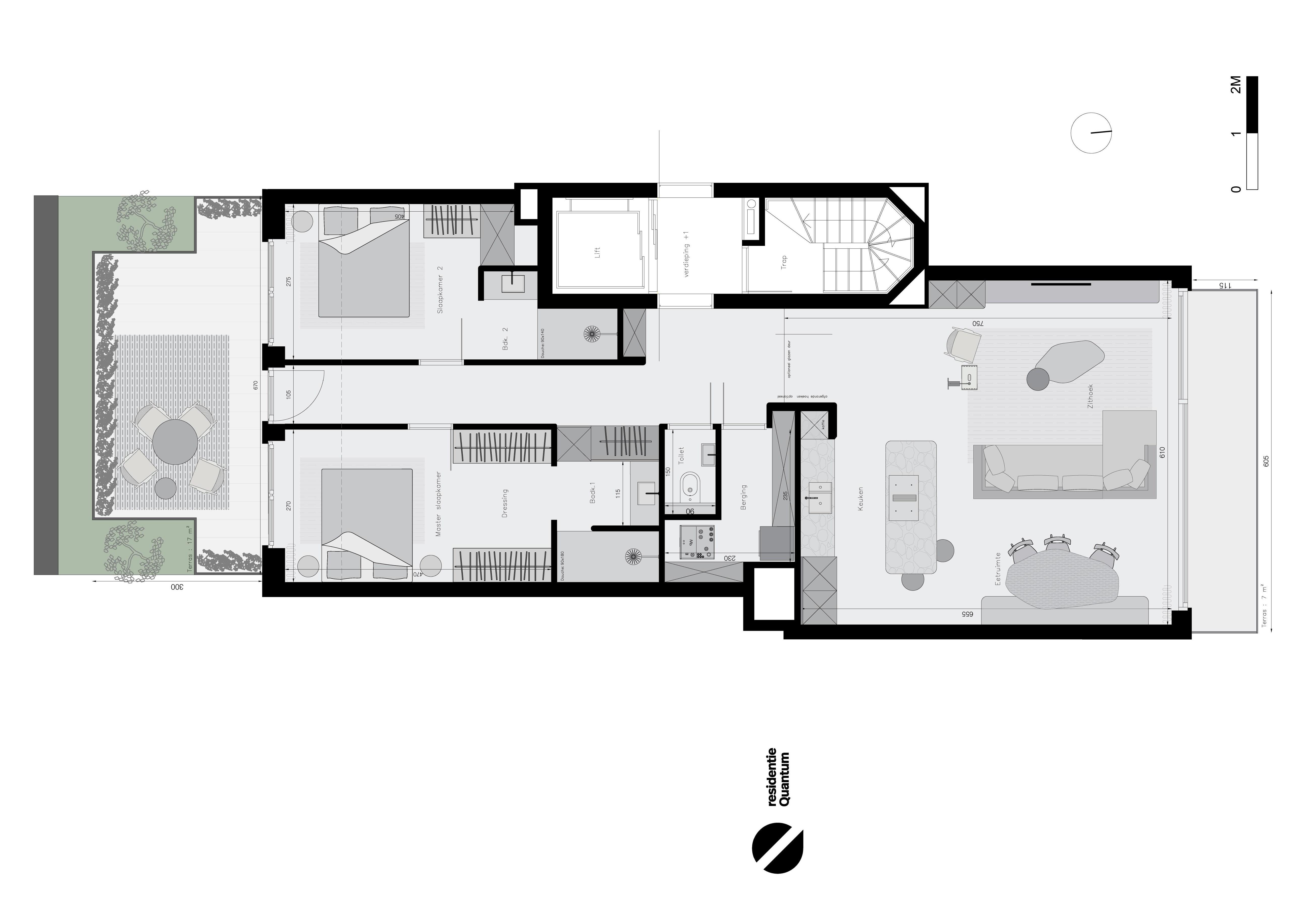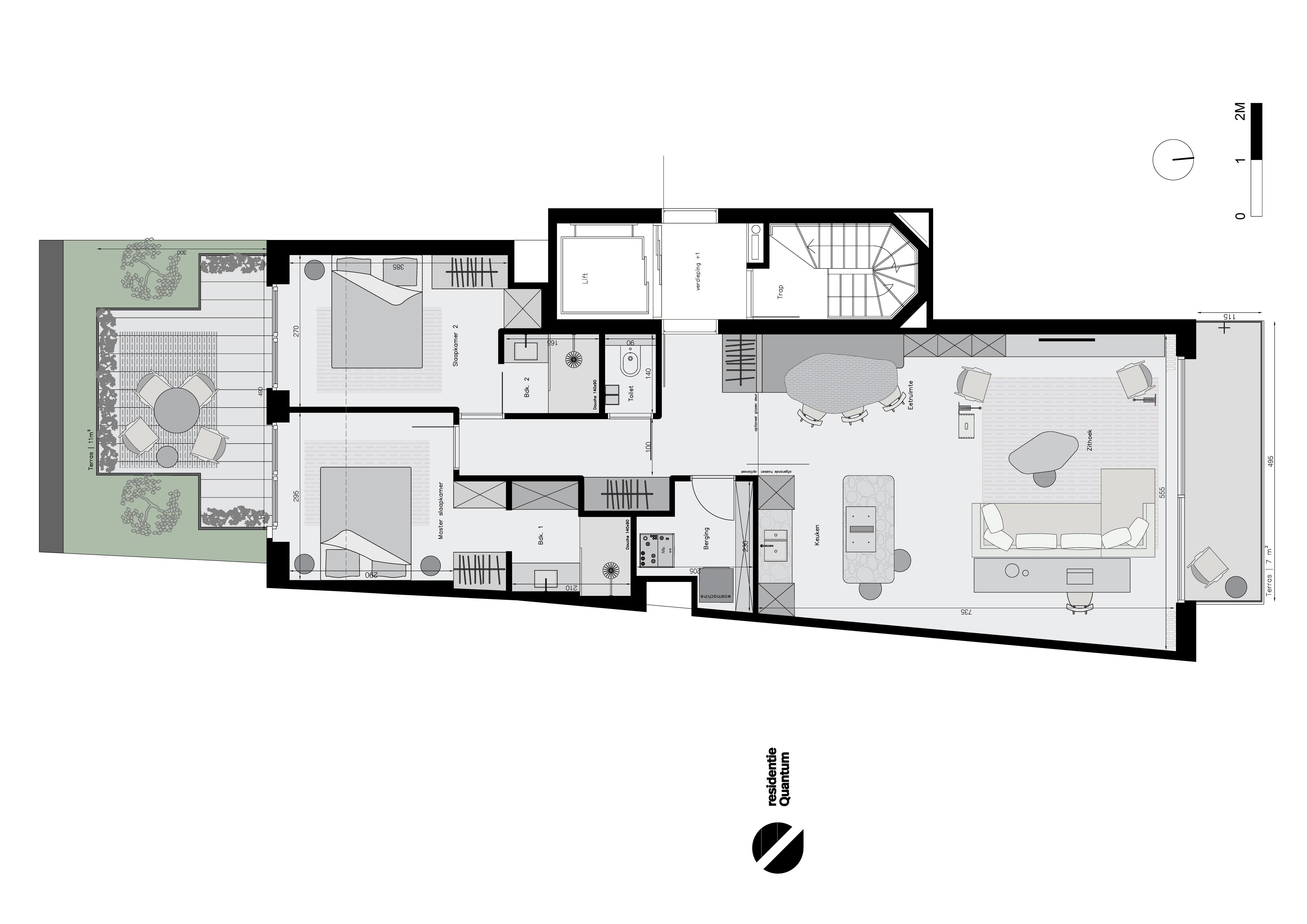 Bovengronds telt Quantum vier appartementen per verdieping, verspreid over vier woonlagen. Elk appartement is doordacht ingedeeld en beschikt over twee ruime slaapkamers, waarbij daglicht niet alleen functioneel is, maar ook rust brengt in het dagelijkse leven.