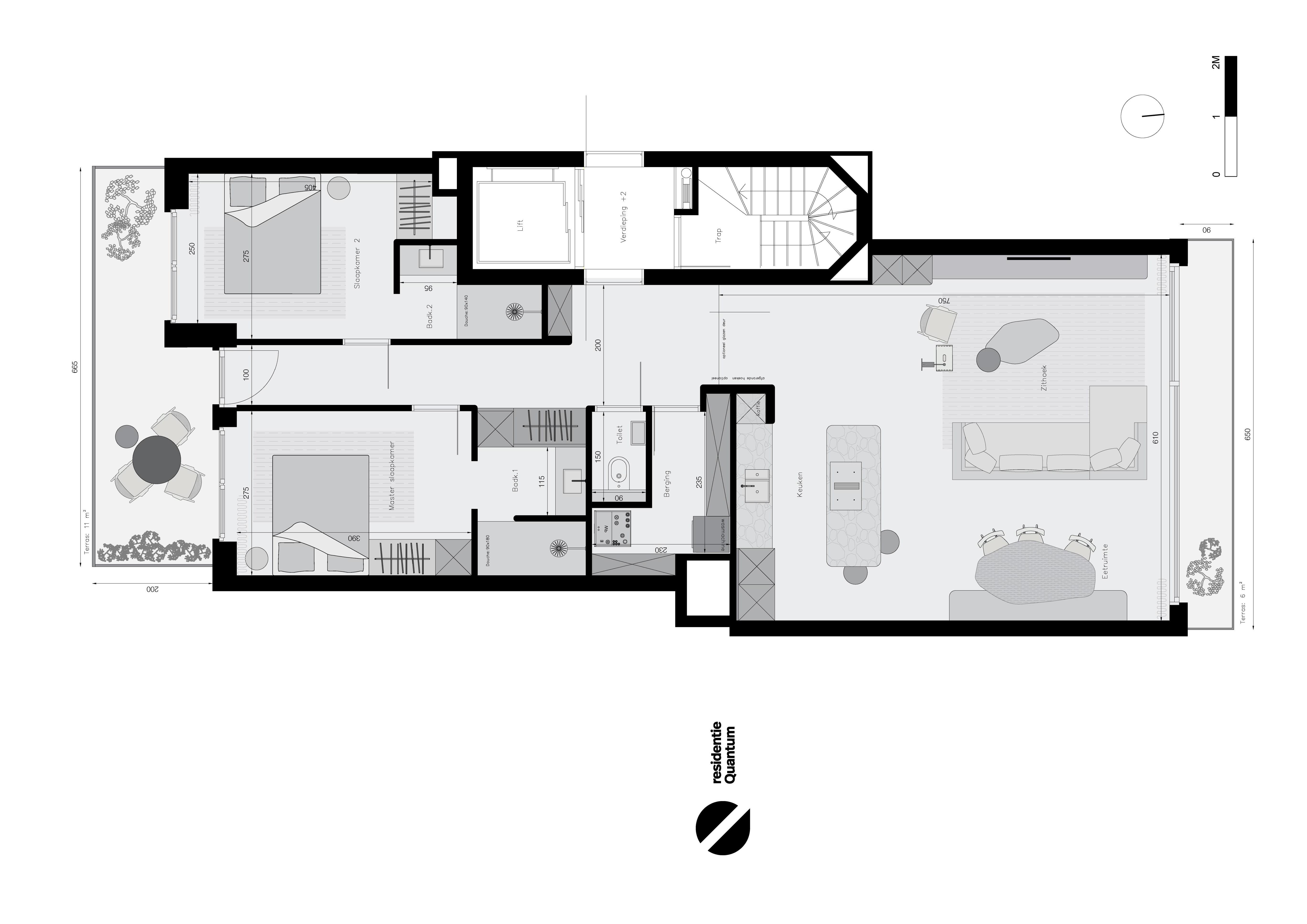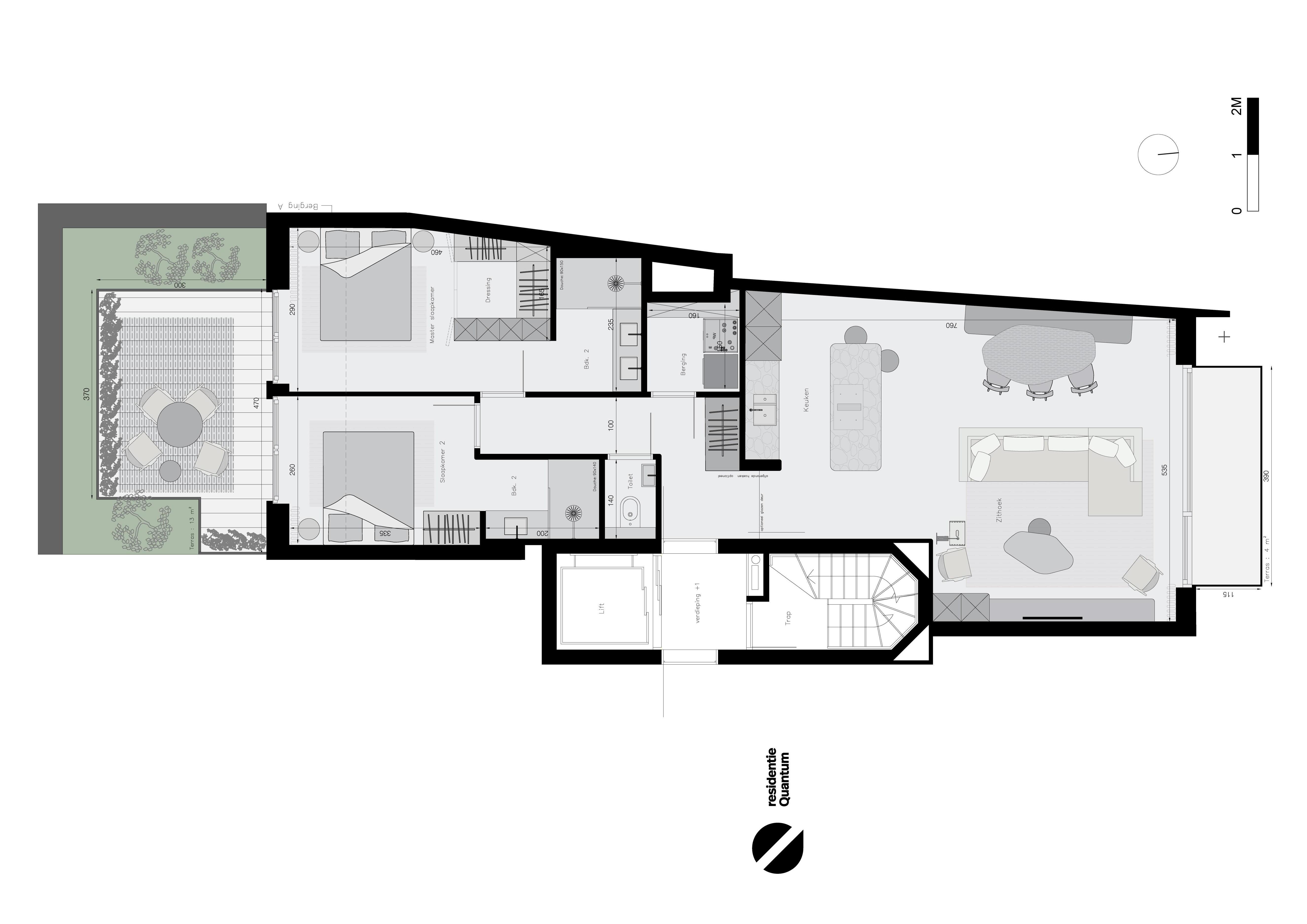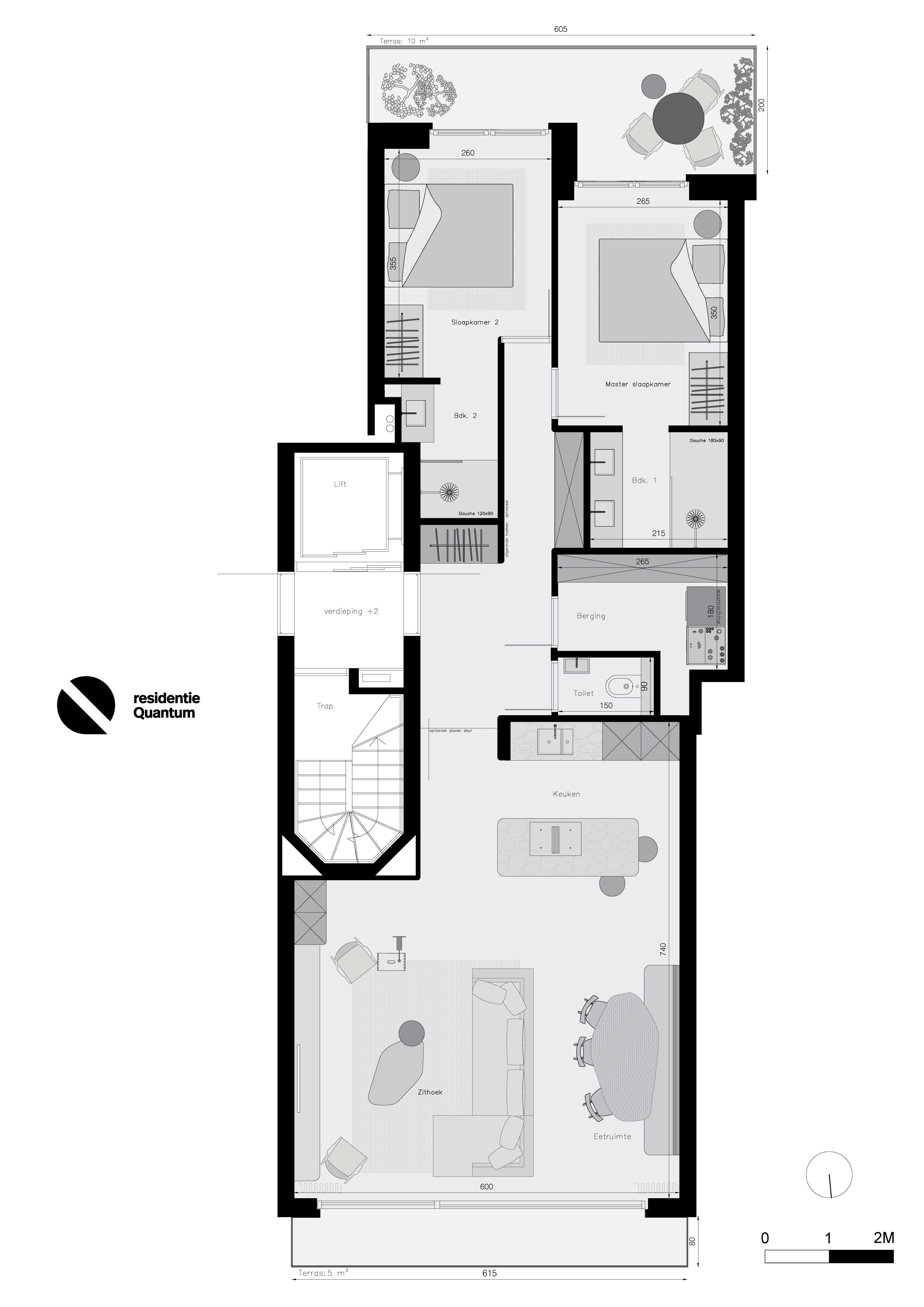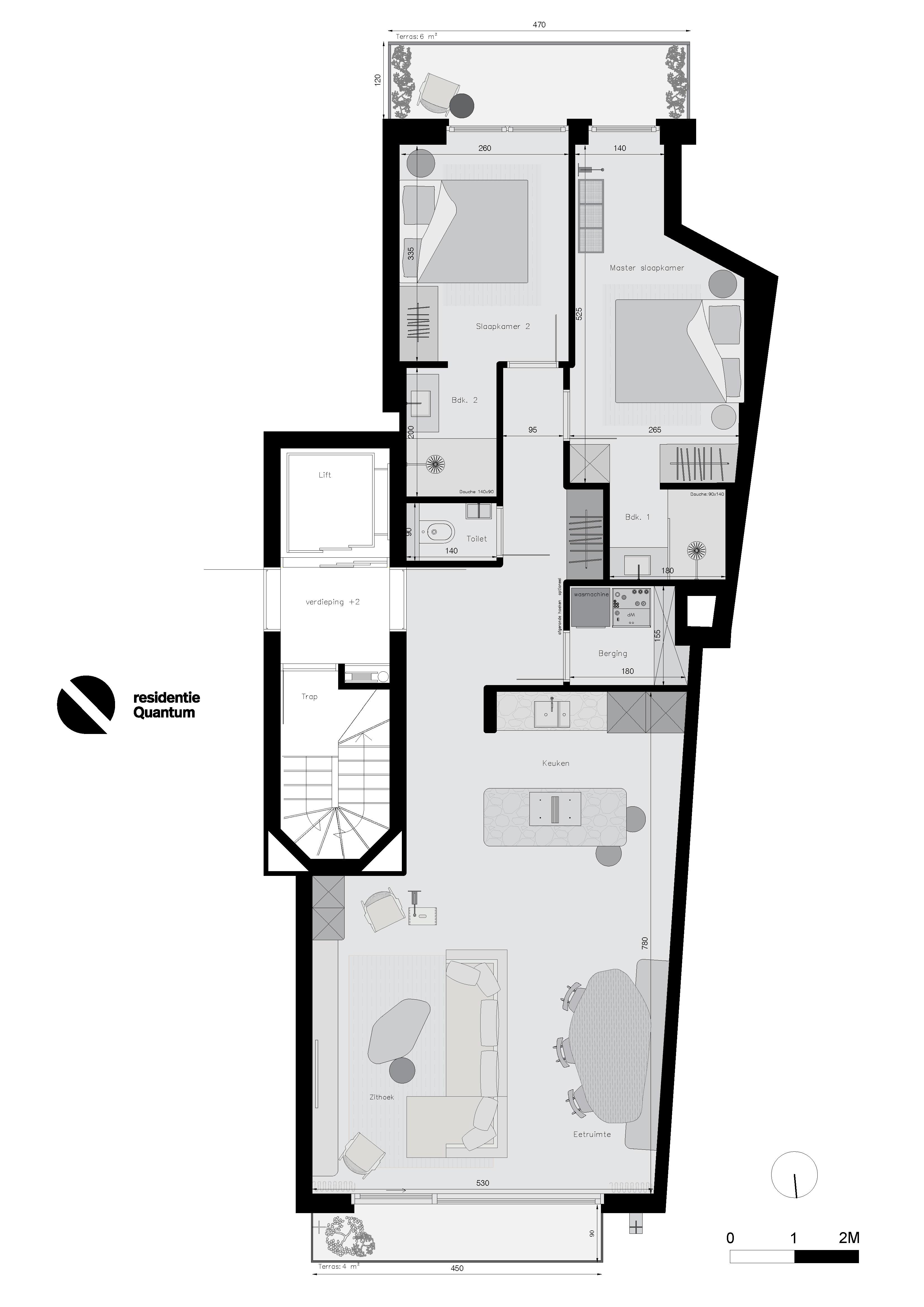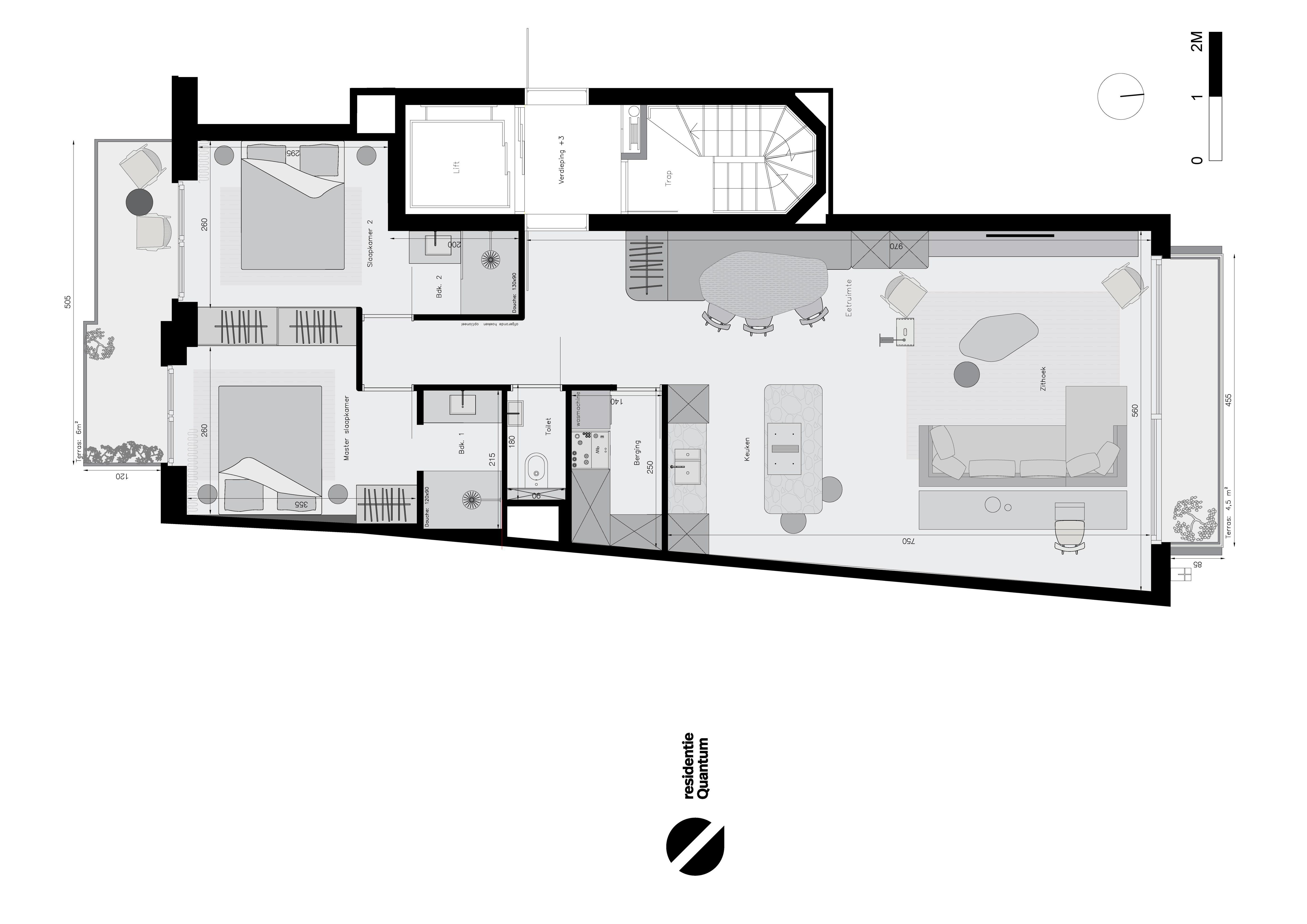 Bovengronds telt Quantum vier appartementen per verdieping, verspreid over vier woonlagen. Elk appartement is doordacht ingedeeld en beschikt over twee ruime slaapkamers, waarbij daglicht niet alleen functioneel is, maar ook rust brengt in het dagelijkse leven.