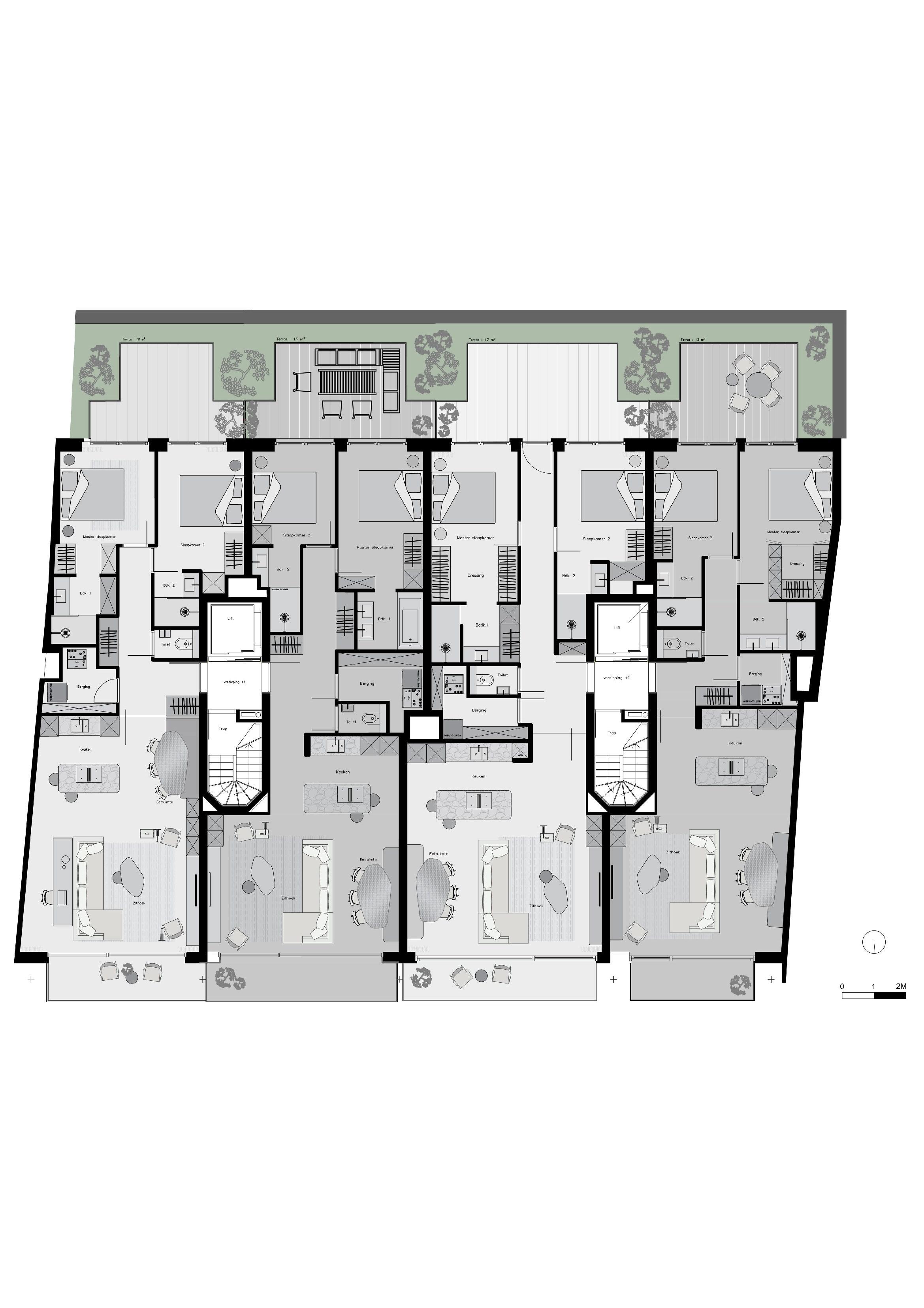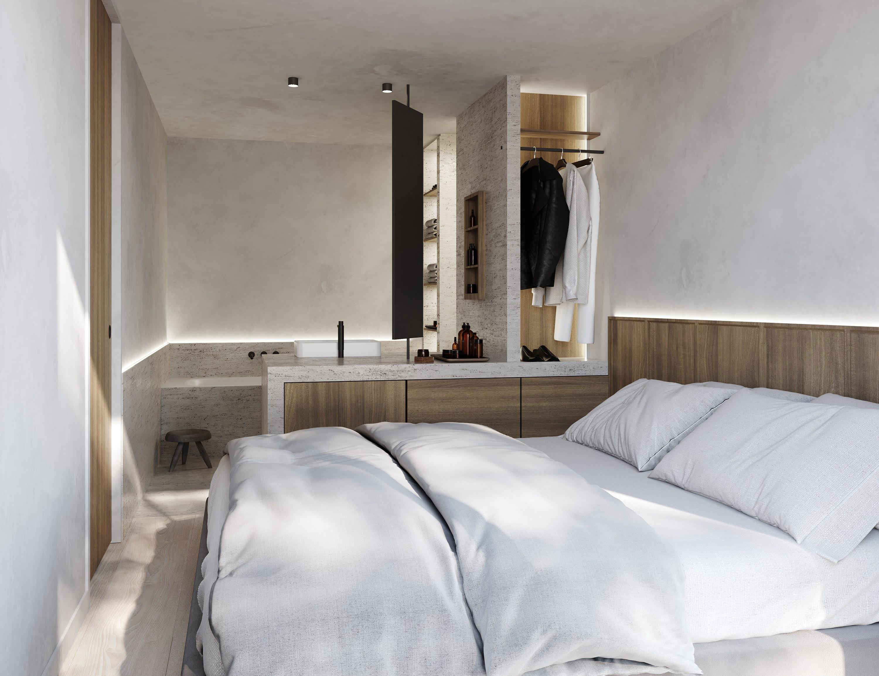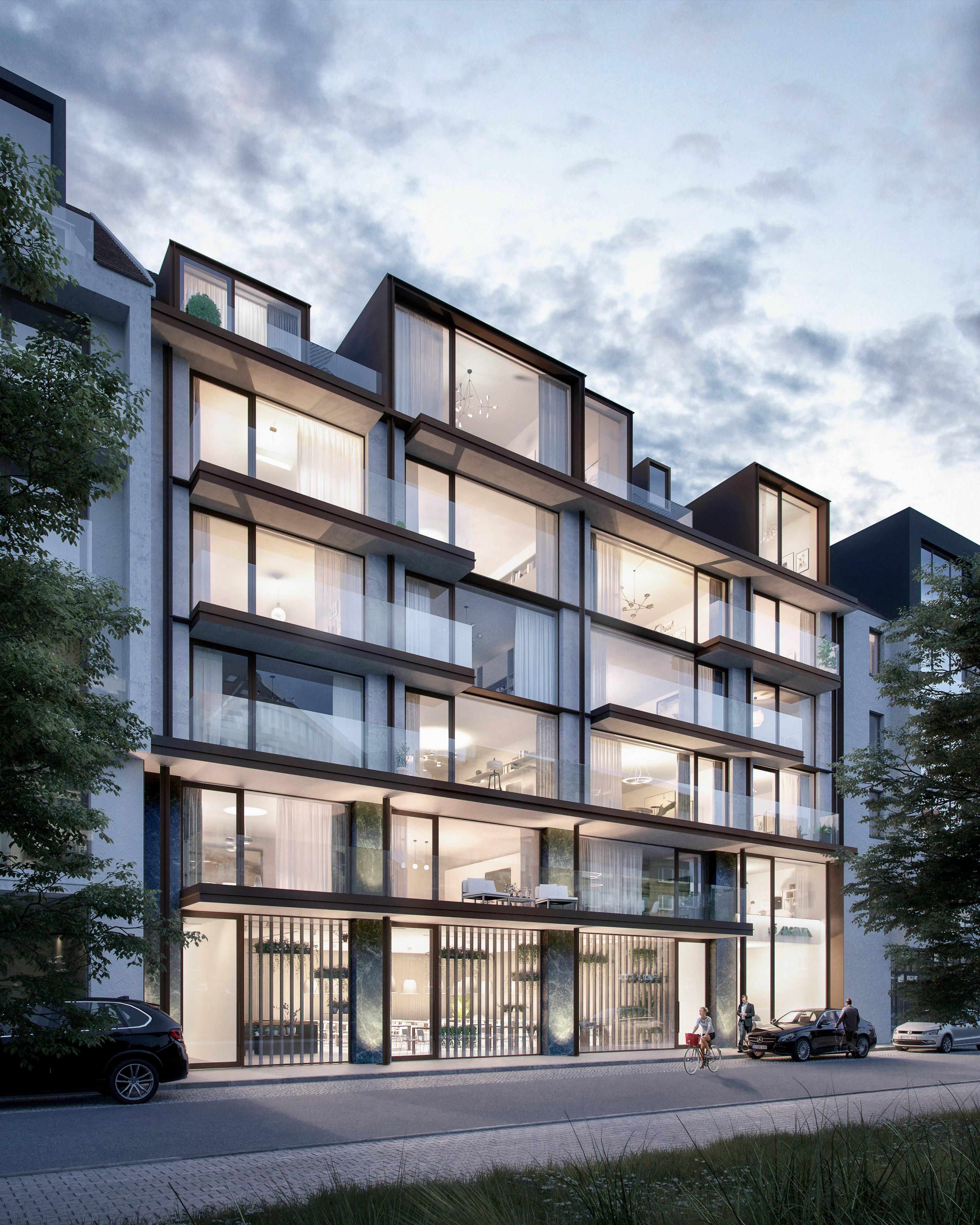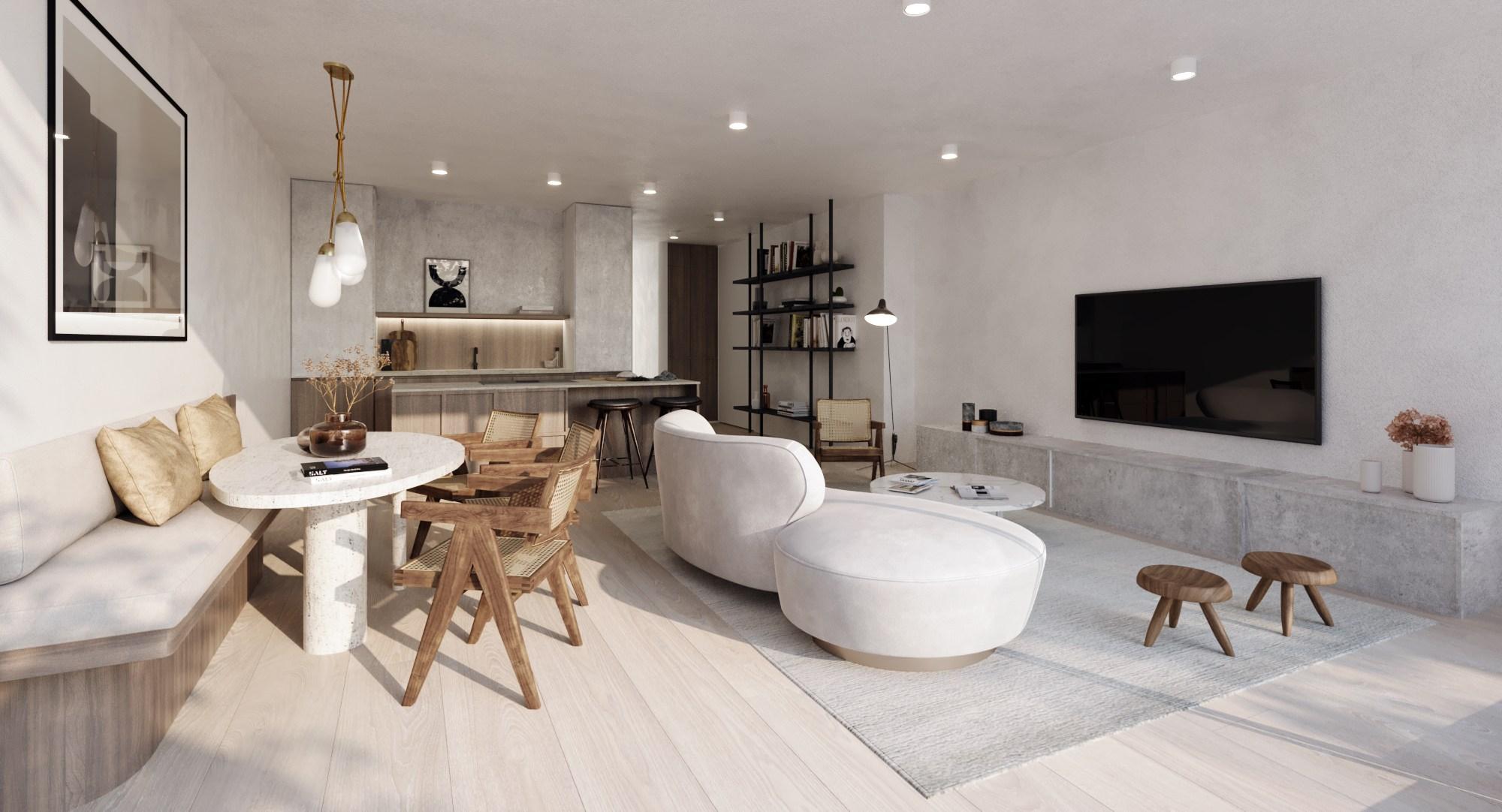 Op de hogere niveaus bevinden zich vier duplex penthouses, subtiel en elegant vormgegeven, met twee slaapkamers en een open, ruimtelijke woonbeleving.