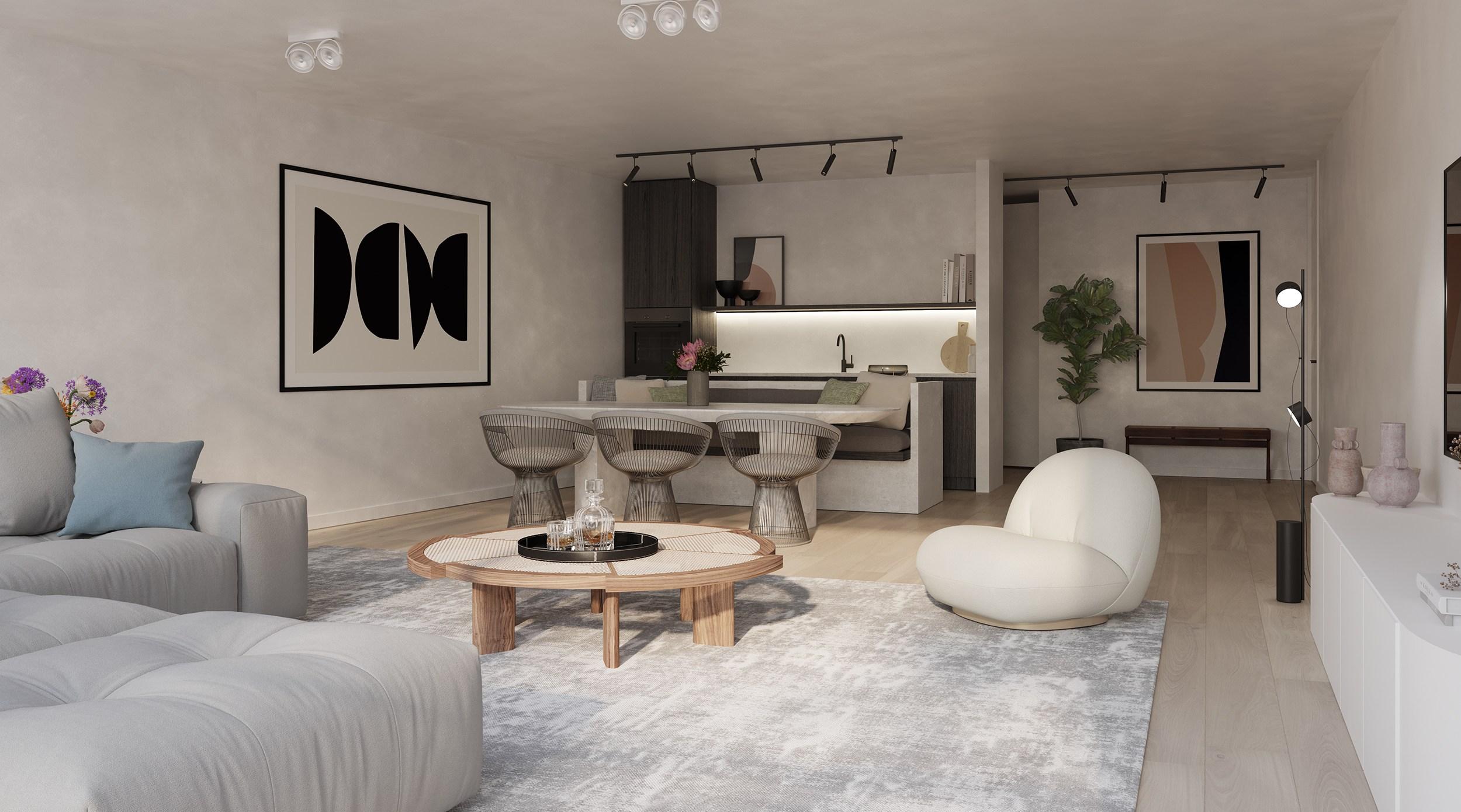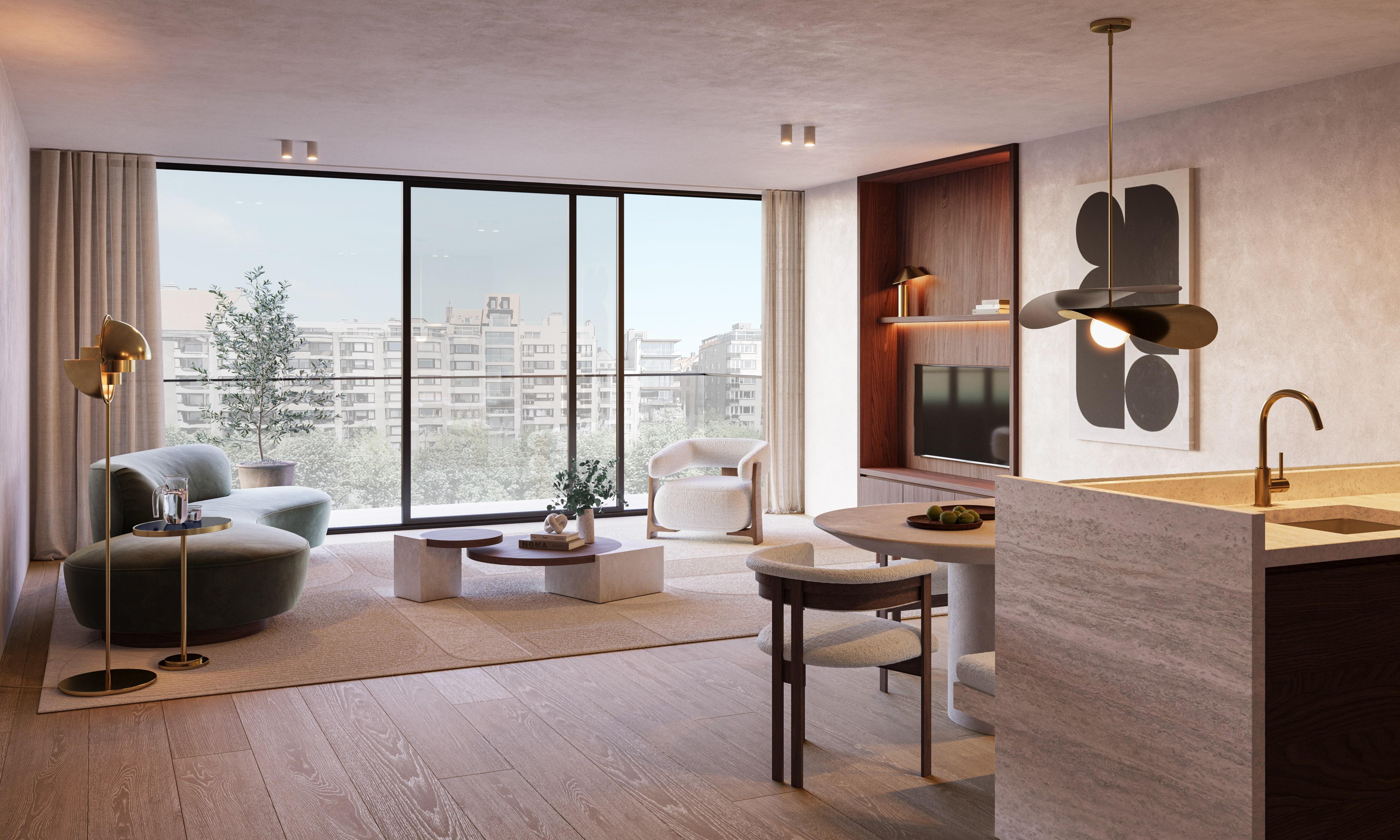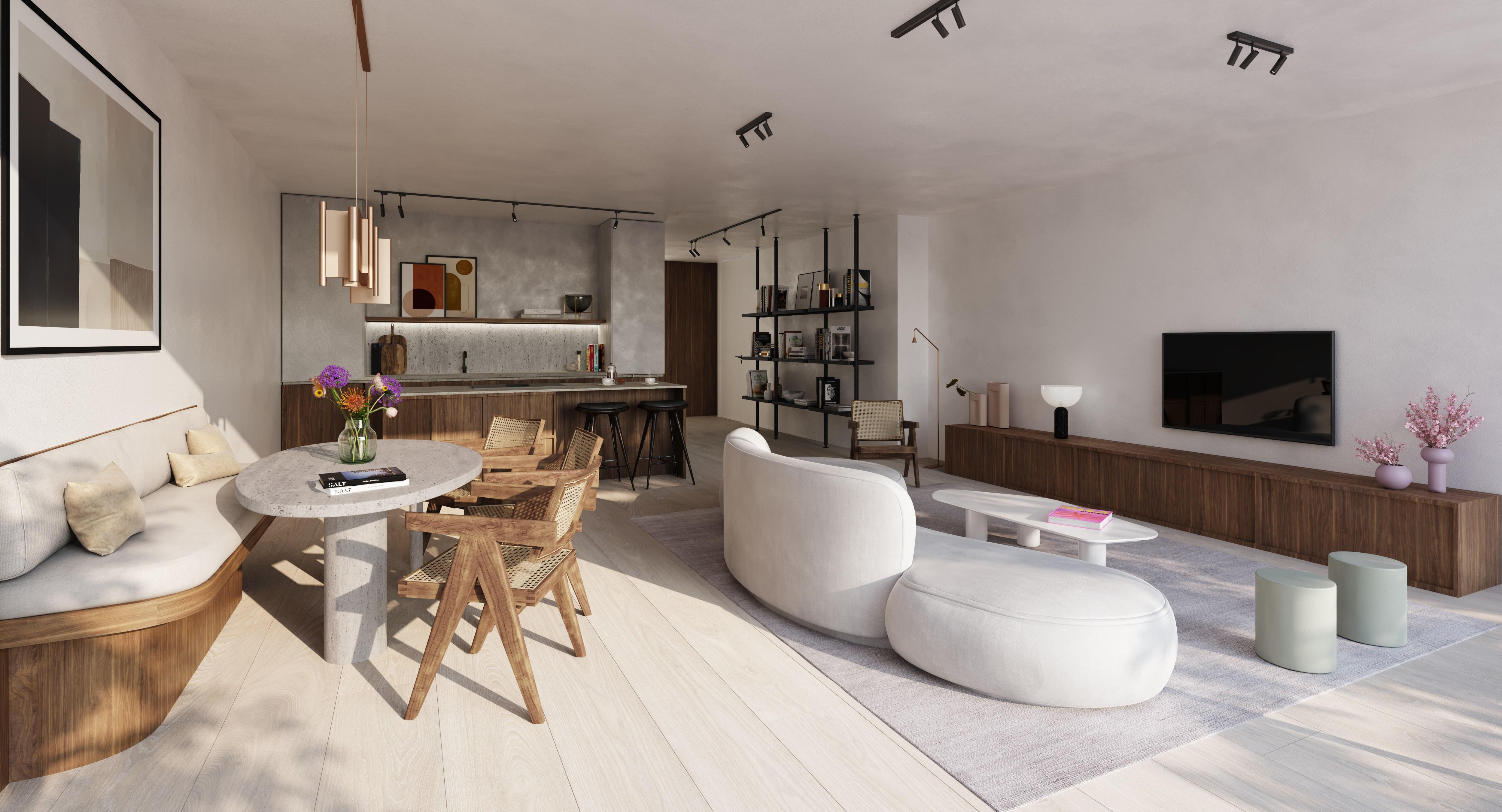 Grote plafondhoge raampartijen en open zichtlijnen zorgen ervoor dat elk appartement elke dag opnieuw helder en open aanvoelt.