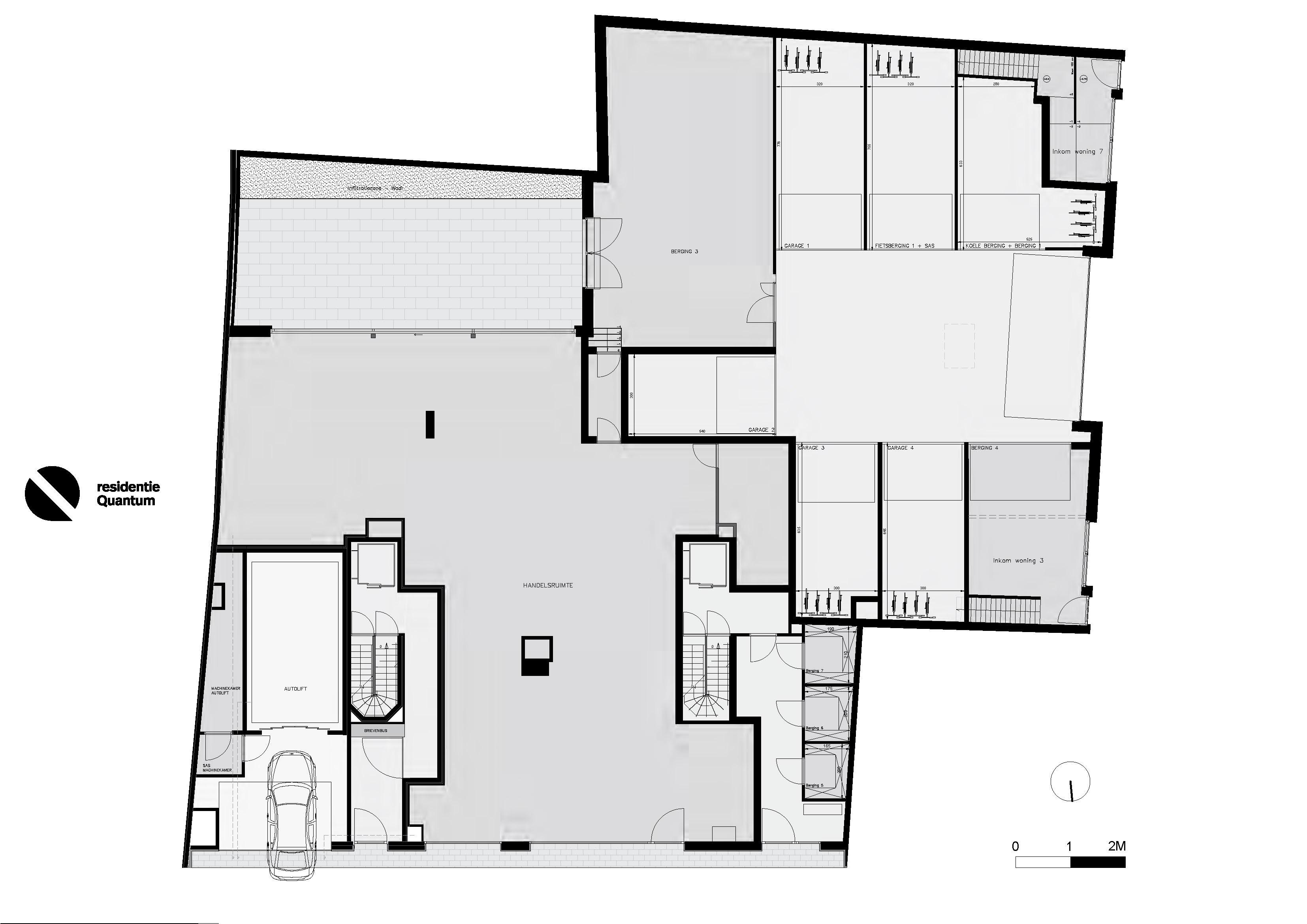 Op het gelijkvloers voorziet Quantum een handelsruimte die op een natuurlijke manier leven en dynamiek brengt in het gebouw en de onmiddellijke omgeving. Zo ontstaat een levendige, aangename straatbeleving zonder in te boeten aan woonkwaliteit.