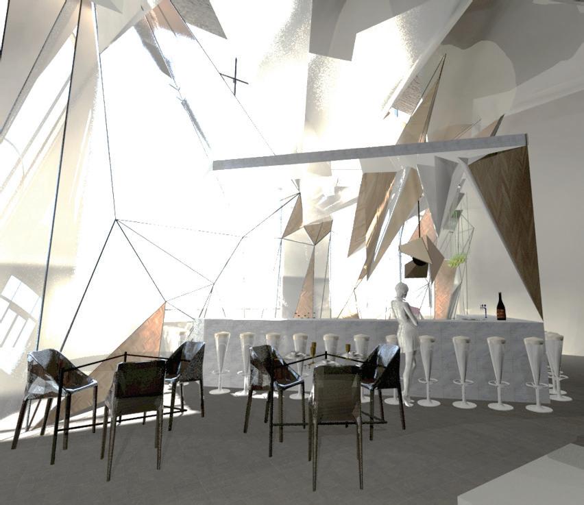 The first inspiration for my project came while playing with paper. Seeing those creases overlapping truly caught my attention and kept me wondering if can we create an interesting design and new experience if we treat the space as a folding paper? Folding a sheet of paper enables structures to reform, it can be seen in some architecture. The folds in space articulate a new relationship through the interior spatial structure and sun path. This crease reforming changes to our perception of a traditional framed space. The paper folds make a statement to be translated in the design to be effective and affective. The formalization of the creases can create an impulsive change of the spatial experience and mood . I represented that by creating a light atrium throughout all the levels of the building dependent upon reflective surfaces like mirrored glass and stainless steel sheets. The commercial space was a sushi café where the users can experience a fast walk through to order and head quickly back to their work. Or other experiences where they engage the whole space and feel the area been folded to let the sun light penetrate to their tables. The residential units where a combination of studio apartments that surround the folding atrium letting the natural light flow through the space. Controlling the light was one of the main problems we faced.