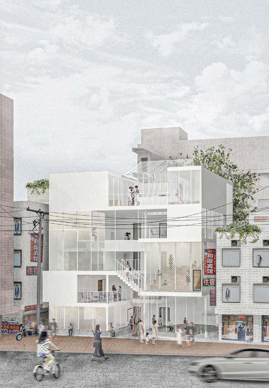 Based on the investigation of the existing behavior activities in the abandoned railway area, the transition space is designed to solve the height difference of the residential areas and schools on both sides of the site meanwhile. It is a display of children and office workers’ behaviors and activities within 1km from their homes. Different groups of people in the community get home after the activities in this transition space on the way home.