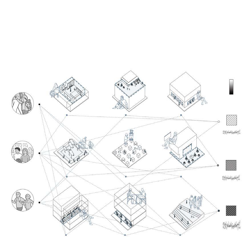 The corridor consists of multiple morphologies depending on the existing spatial organisation. There are various possibilities to connectthe existing spatial composition with the new green corridor, such as the connection on the rooftop garden, between buildings, riverside area, gardens, and additional facades for existing buildings.