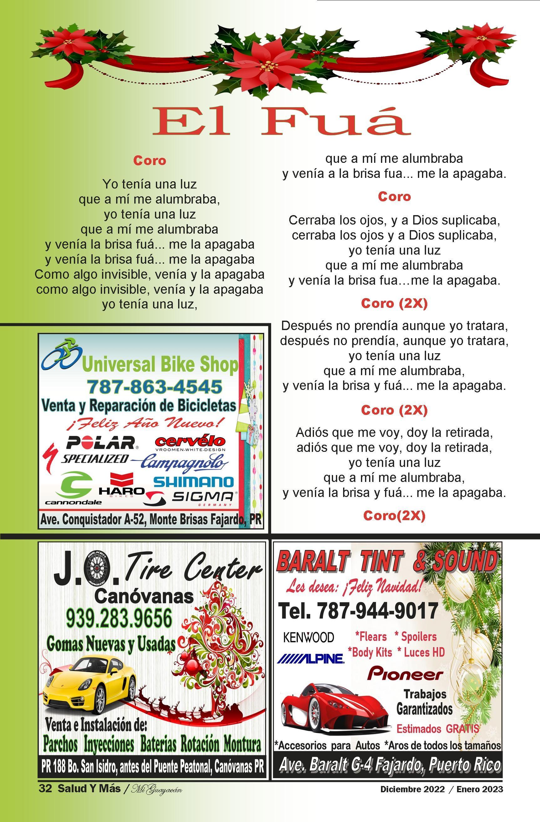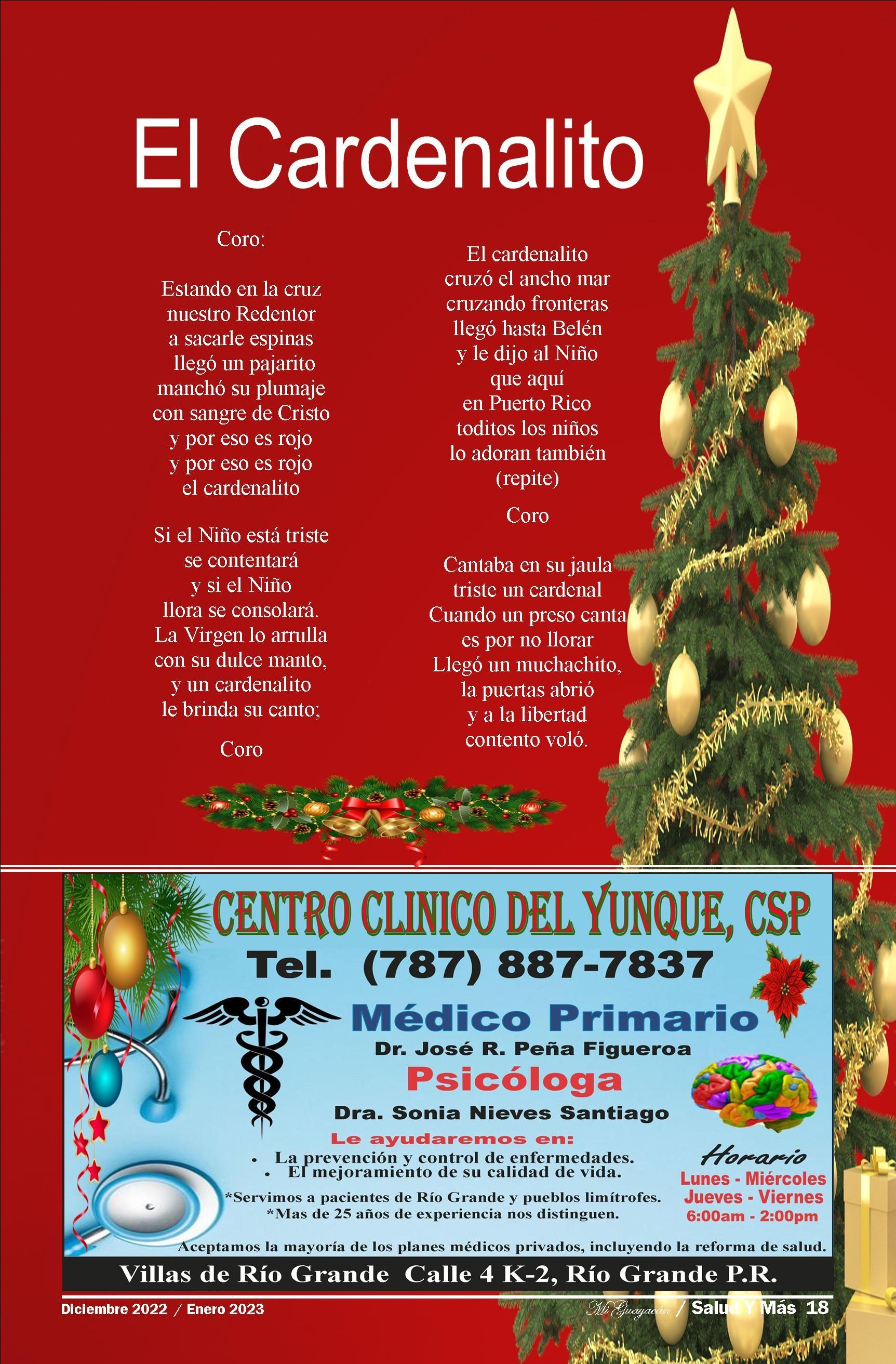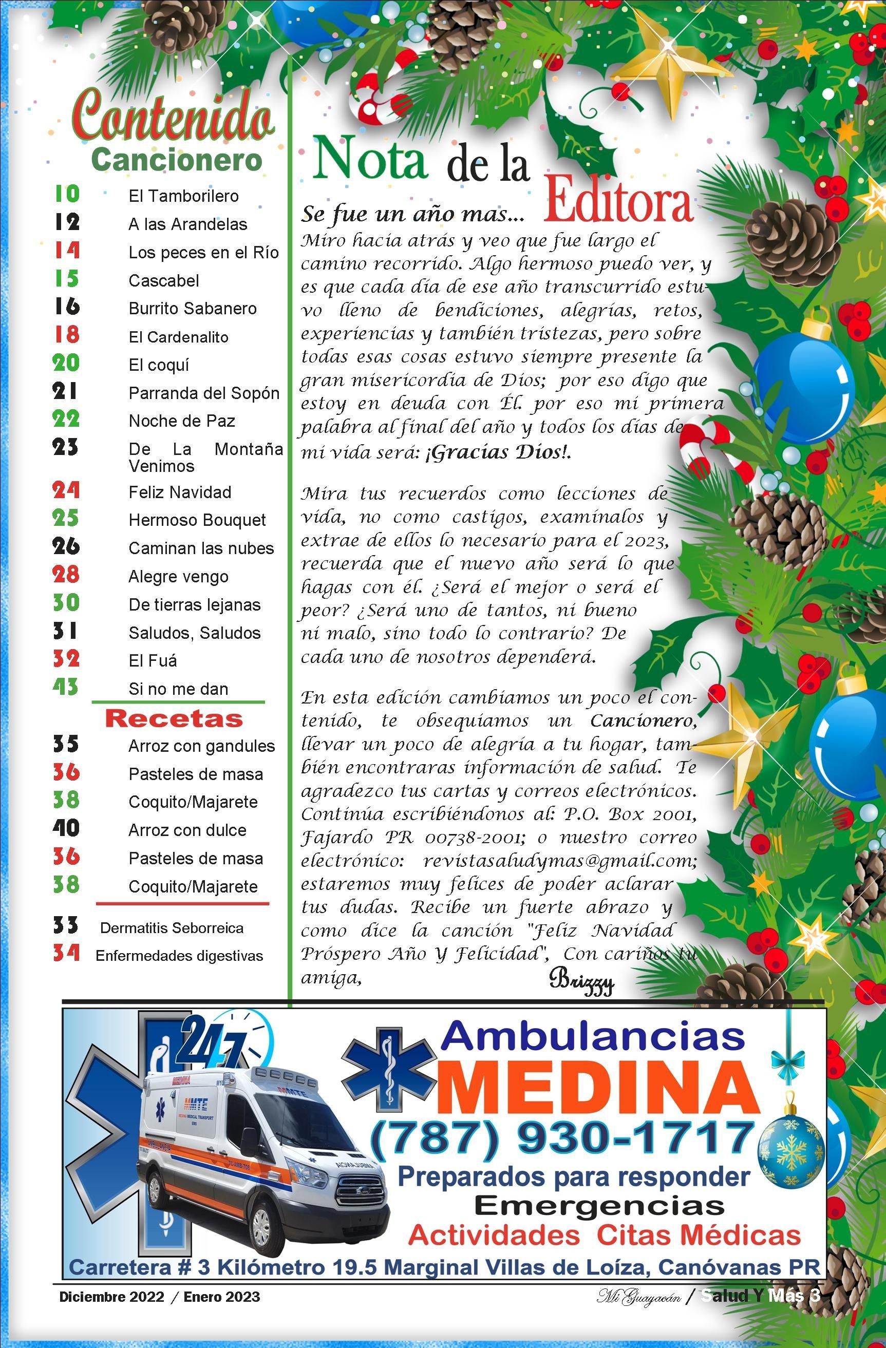 Se fue un año mas... Miro hacia atrás y veo que fue largo el camino recorrido. Algo hermoso puedo ver, y es que cada día de ese año transcurrido estuvo lleno de bendiciones, alegrías, retos,experiencias y también tristezas, pero sobre todas esas cosas estuvo siempre presente la gran misericordia de Dios; por eso digo que estoy en deuda con Él. por eso mi primera palabra al final del año y todos los días de mi vida será: ¡Gracias Dios!.En esta edición cambiamos un poco el contenido, te obsequiamos un Cancionero, llevar un poco de alegría a tu hogar, también encontraras información de salud. Recibe un fuerte abrazo y como dice la canción "Feliz Navidad Próspero Año Y Felicidad", Con cariños tu amiga, Brizzy