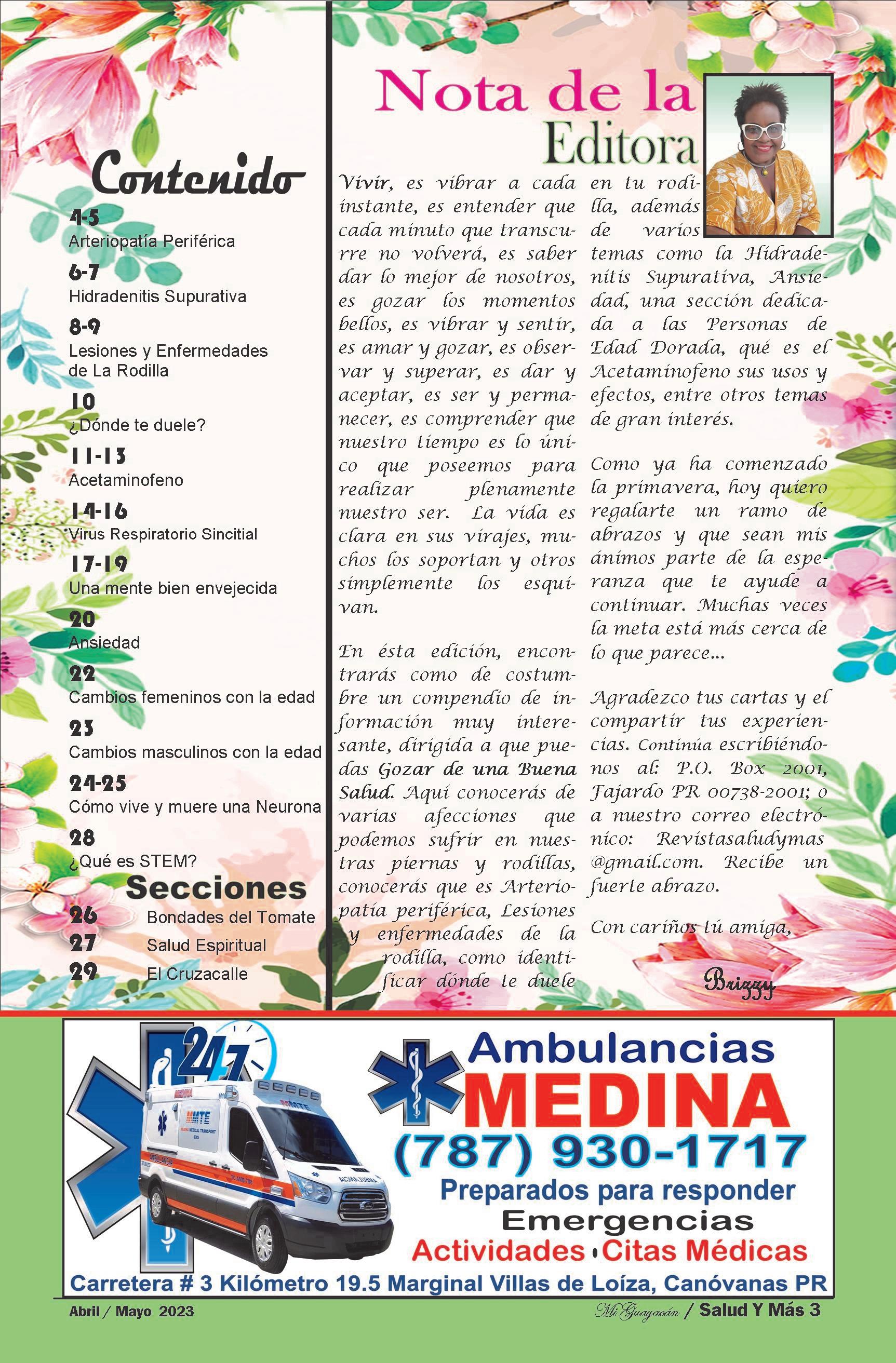 Vivir, es vibrar a cada instante, es entender que cada minuto que transcurre no volverá, es saber dar lo mejor de nosotros, es gozar los momentos bellos. La vida es clara en sus virajes, muchos los soportan y otros simplemente los esquivan. En ésta edición, encontrarás información muy interesante, dirigida a que puedas Gozar de una Buena Salud. Conocerás varias afecciones que podemos sufrir en nuestras piernas y rodillas, conocerás que es Arteriopatía periférica, Lesiones y enfermedades de la rodilla, como identificar dónde te duele en tu rodilla, además de varios temas como la Hidradenitis Supurativa, Ansiedad, una sección dedicada a las Personas de Edad Dorada, qué es el Acetaminofeno sus usos y efectos, entre otros temas de gran interés. Recibe un fuerte abrazo con cariños tú amiga, Brizzy