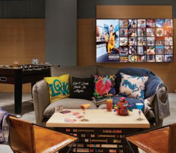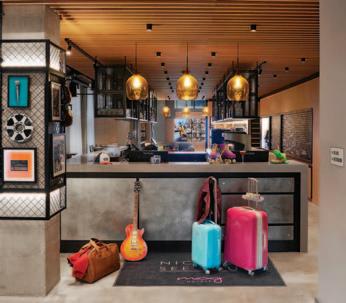 The contemporary neighbourhood hotel structure is a nine-storey build clad in weathered-effect metal panels to give an urban contrast to the original facade, which has been retained from the former hat factory it used to be. The 146 stylish and smartly designed bedrooms offer plush platform beds, a workspace, walk-in showers, TVs with Netflix, open-wall wardrobes and motionactivated LED guide lights. Plus, they’re pet friendly, so your fur baby is welcome to come along too! Designed with social medialovers in mind, Moxy is the first Manchester hotel to have a digital ‘Guestbook’ wall. The Guestbook streams photos and videos that Moxy guests have shared to the social sphere. ‘Moxy moments’ are shared on the wall, which constantly changes as the social feed is updated.