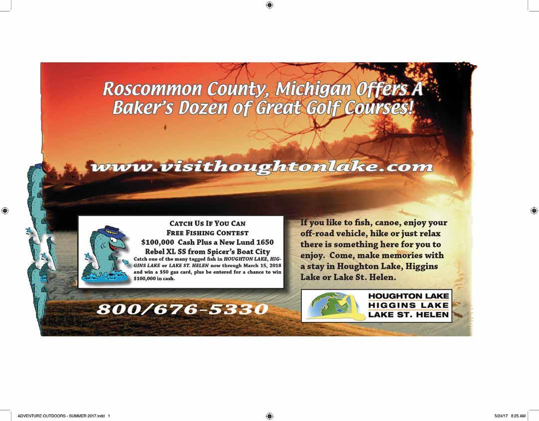Family Memories Begin with a Summer Vacation in Houghton Lake, Michigan! www.visithoughtonlake.com 800/ 676-5330 Michigan’s Other Great Lakes • Houghton Lake • Higgins Lake • Lake St. Helen Located in Beautiful Roscommon County Catch Us If You Can Free Fishing Contest $100,000 Cash Plus a New Lund 1650 Rebel XL SS from Spicer’s Boat City Catch one of the many tagged fish in HOUGHTON LAKE, HIGGINS LAKE or LAKE ST. HELEN now through March 15, 2018 and win a $50 gas card, plus be entered for a chance to win $100,000 in cash.