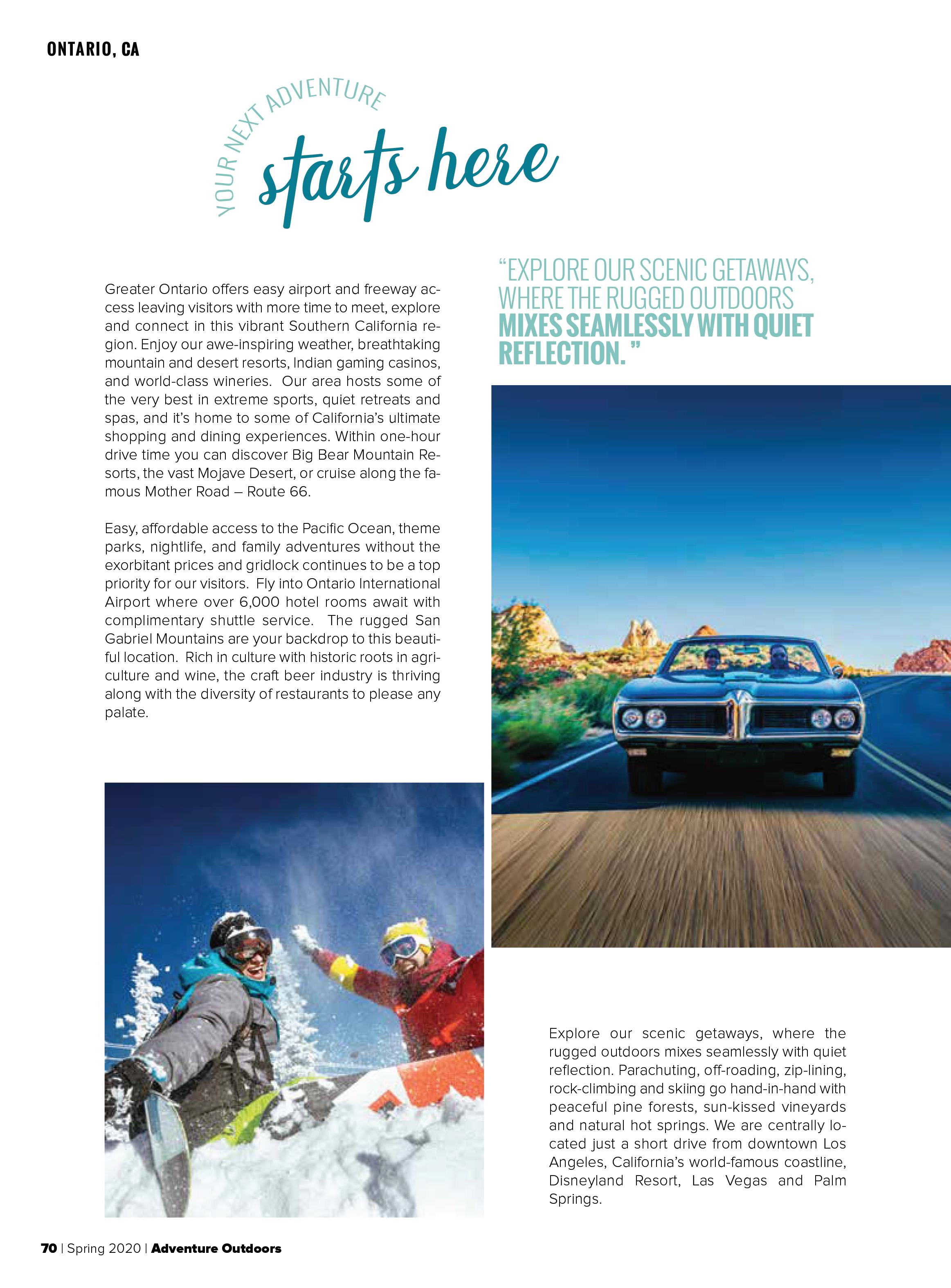 We, the Adventure Outdoors team of David-Jacobs Publishing Group, are more than excited to bring you this 2020 spring issue of Adventure Outdoors Magazine. Inside this issue, you will find majestic waterfalls all over the country, waiting for you to take them in. Or perhaps your tastes veer to the unusual, and our article on offbeat excursions is more your style. Whatever outdoor adventure your heart desires, Adventure Outdoors is here to help you have the trip of a lifetime.
