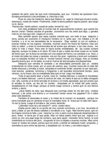 estaban de parto, para las que eran malcasadas, que sus maridos las quisiesen bien. Echaba pronósticos a las preñadas; si traía hijo o hija. Pues en caso de medicina, decía que Galeno no supo la mitad que él para muela, desmayos, males de madre. Finalmente, nadie le decía padecer alguna pasión, que luego no le decía: "Haced esto, haréis estotro, cosed tal yerba, tomad tal raiz." Con esto andábase todo el mundo tras él, especialmente mujeres, que cuanto les decían creían. Déstas sacaba él grandes provechos con las artes que digo, y ganaba más en un mes que cien ciegos en un año. Mas también quiero que sepa vuestra merced que, con todo lo que adquiría y tenía, jamás tan avariento ni mezquino hombre no vi, tanto que me mataba a mí de hambre, y a sí no me demediaba de lo necesario. Digo verdad; si con mi sotileza y buenas mañas no me supiera remediar, muchas veces me finara de hambre; mas con todo su saber y aviso le contraminaba de tal suerte que siempre, o las más veces, me cabía lo más y mejor. Para esto le hacía burlas endiabladas, de las cuales contaré algunas, aunque no todas a mi salvo. Él traía el pan y todas las otras cosas en un fardel de lienzo que por la boca se cerraba con una argolla de hierro y su candado y su llave, y al meter de todas las cosas y sacarlas, era con tan gran vigilancia y tanto por contadero, que no bastaba hombre en todo el mundo hacerle menos una migaja; mas yo tomaba aquella laceria que el me daba, la cual en menos de dos bocados era despachada. Después que cerraba el candado y se descuidaba pensando que yo estaba entendiendo en otras cosas, por un poco de costura, que muchas veces del un lado del fardel descosía y tornaba a coser, sangraba el avariento fardel, sacando no por tasa pan, mas buenos pedazos, torreznos y longaniza; y así buscaba conveniente tiempo para rehacer, no la chaza, sino la endiablada falta que el mal ciego me faltaba. Todo lo que podía sisar y hurtar, traía en medias blancas; y cuando le mandaban rezar y le daban blancas, como él carecía de vista, no había el que se la daba amagado con ella, cuando yo la tenía lanzada en la boca y la media aparejada, que por presto que él echaba la mano, ya iba de mi cambio aniquilada en la mitad del justo precio. Quejábaseme el mal ciego, porque al tiento luego conocía y sentia que no era blanca entera, y decía: -¿Qué diablo es esto, que después que conmigo estás no me dan sino medias blancas, y de antes una blanca y un maravedí hartas veces me pagaban? En ti debe estar esta desdicha. Tambien él abreviaba el rezar y la mitad de la oración no acababa, porque me tenía mandado que en yéndose el que la mandaba rezar, le tirase por el cabo del capuz. Yo así lo hacia. Luego él tornaba a dar voces, diciendo: "¿Mandan rezar tal y tal oración?", como suelen decir. Usaba poner cabe sí un jarrillo de vino cuando comíamos, y yo muy de presto le asía y daba un par de besos callados y tornábale a su lugar. Mas duróme poco, que en los tragos conocía la falta, y por reservar su vino a salvo nunca después desamparaba el jarro, antes lo tenía por el asa asido. Mas no había piedra imán que así trajese a sí como yo con una paja larga de centeno, que para aquel menester tenía hecha, la cual metiéndola en la boca del jarro, chupando el vino lo dejaba a buenas noches. Mas como fuese el traidor tan astuto, pienso que me sintió, y dende en adelante mudó propósito, y asentaba su jarro entre las piernas, y atapábale con la mano, y así bebía seguro.