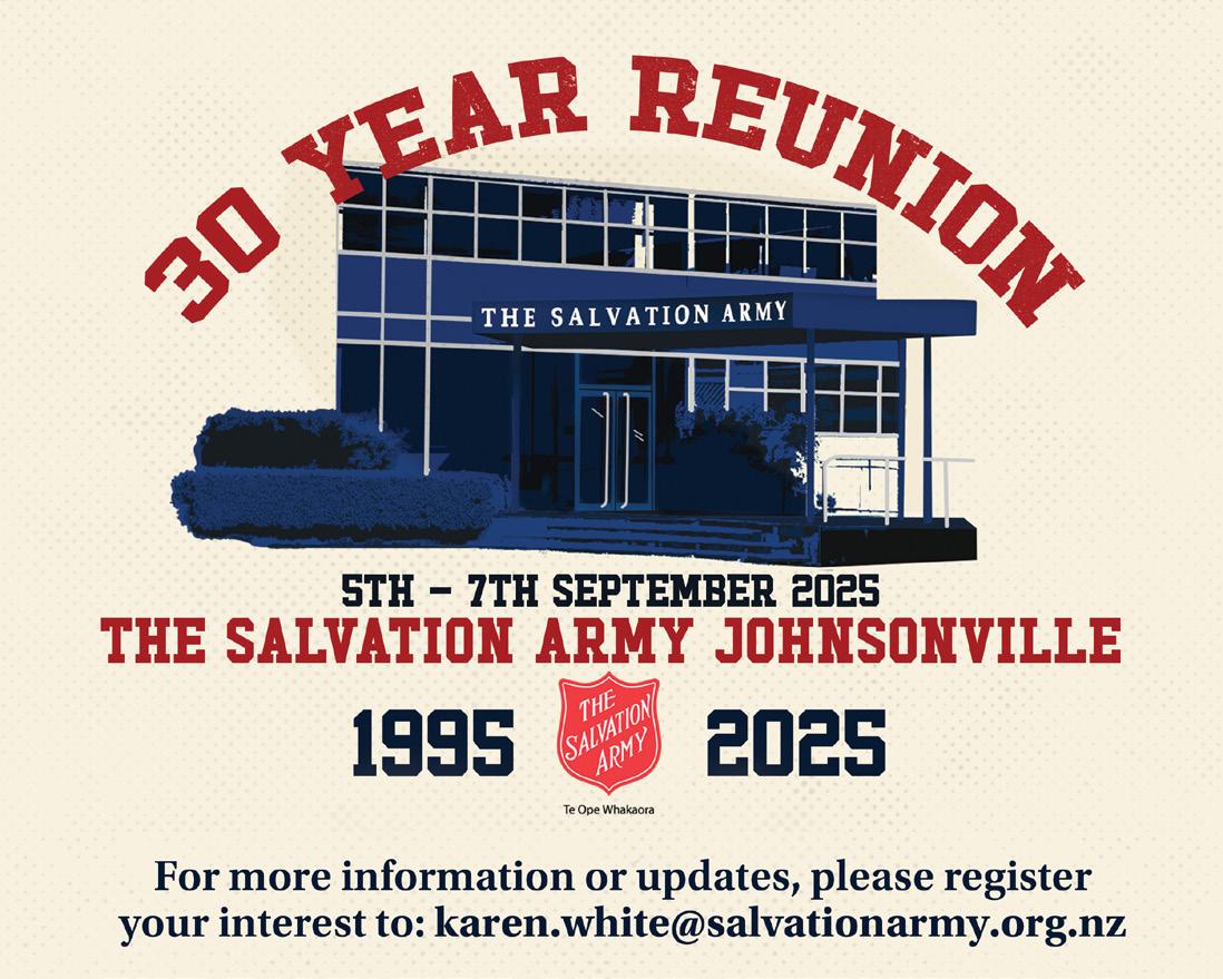 Save the Date: Porirua Corps 60th Anniversary Labour weekend, 25–26 October 2025. To register your interest, email nicki.dutton@salvationarmy.org.nz with Porirua 60th in the subject line.