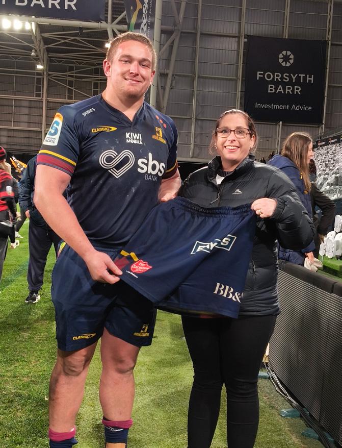On Saturday 26 April, the Highlanders rugby team played a pre-season rugby match against the Crusaders at Forsyth Bar Stadium in Dunedin. Invercargill Salvation Army’s Community Ministries Food Security Coordinator Melissa Dimmock attended the match with her rugby-mad sons and was thrilled to not only meet but also receive a signed pair of game shorts from Highlander’s prop, Ethan DeGroot. The Salvation Army and the Dunedin-based Highlanders have teamed up this season, with the iconic red shield adorning the players’ shorts. ‘Having someone as high-profile as Ethan wearing the red shield logo is huge,’ says Melissa, who plans to have the shorts framed and hung in the foodbank to encourage more donations.