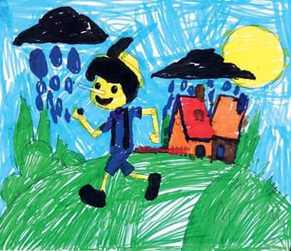 Here’s another pukka Pinocchio Colouring. This one was completed by Scarlett, age 6. Great use of imagination to add some extra rain clouds –Pinocchio still looks happy despite the weather!